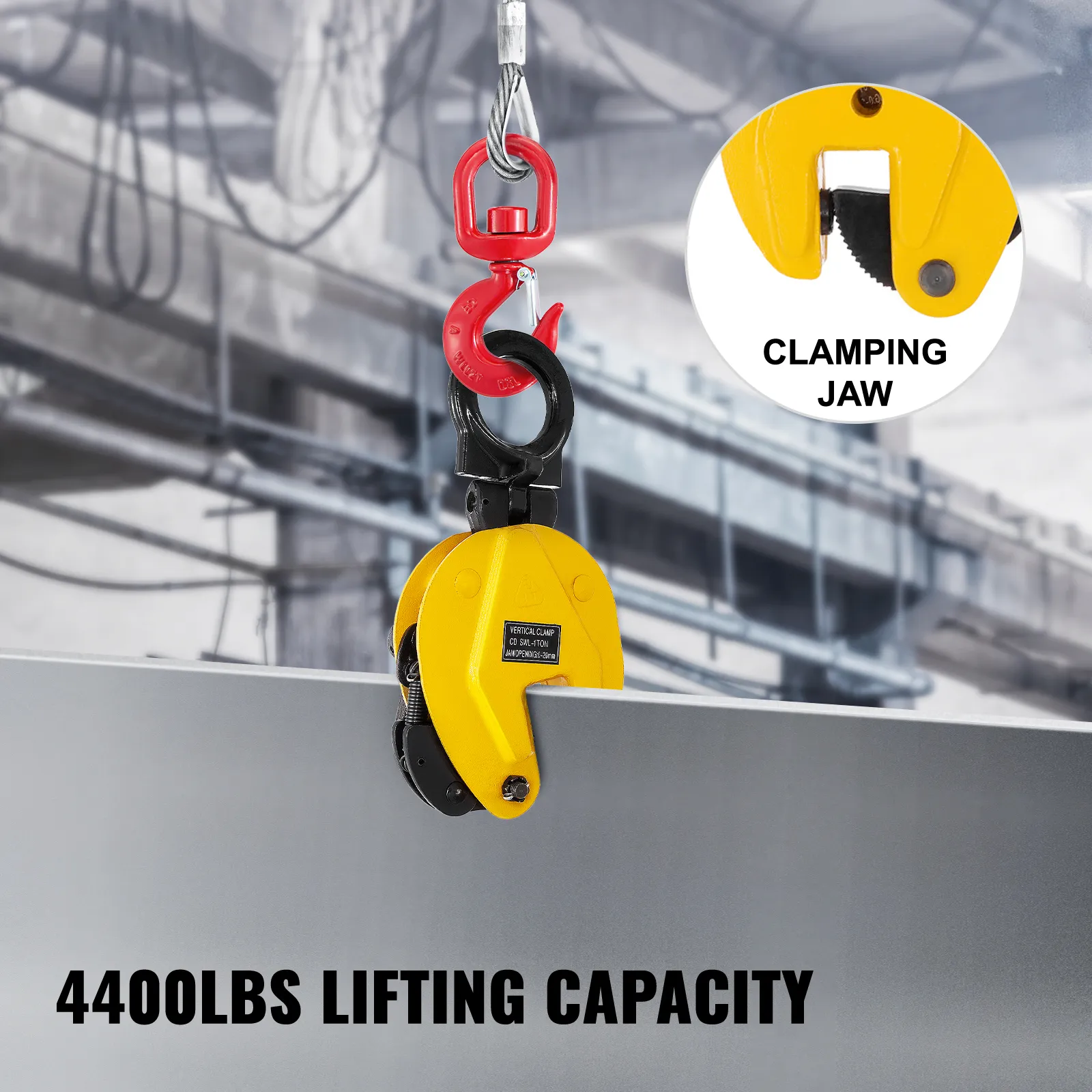 Capacidad de elevación de 4400 lb: límite de carga de trabajo de 4400 lb/2t. Apertura de mandíbula de hasta 1". Dimensión de la abrazadera de elevación de placa de metal: 13''x5.8''x3''.