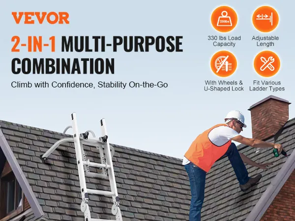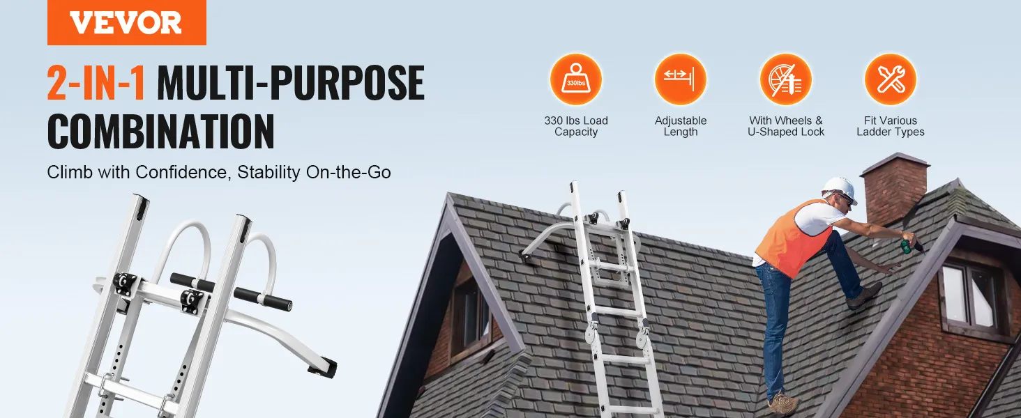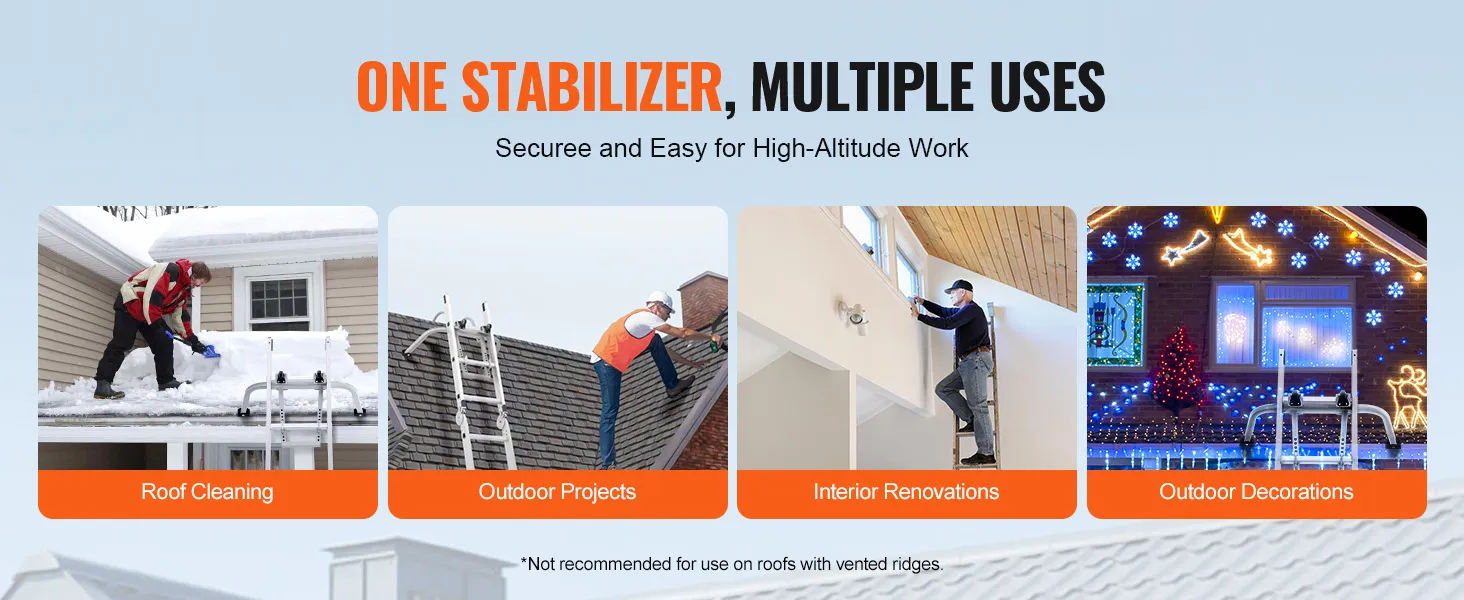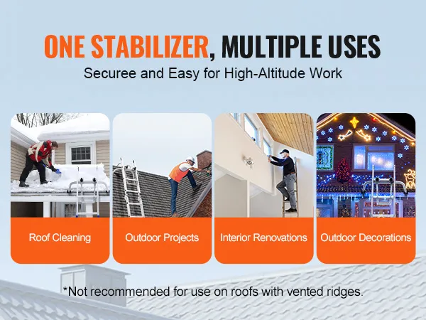 Diseñado para múltiples aplicaciones, nuestro estabilizador de escalera hace que el trabajo a gran altura sea fácil y seguro. Ideal para limpieza de techos, tareas al aire libre, renovaciones interiores y decoraciones exteriores. Nota: No se recomienda para techos con cumbreras ventiladas.