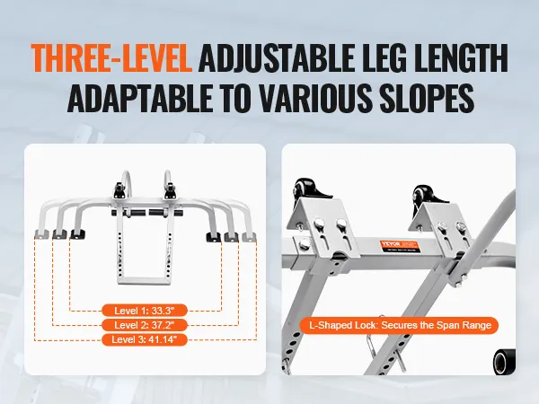 Ajustable en tres posiciones, la longitud de las patas se adapta a distintas inclinaciones para brindar un soporte sólido. Equipado con clips de bloqueo confiables, garantiza seguridad y flexibilidad a cualquier altura o ángulo.