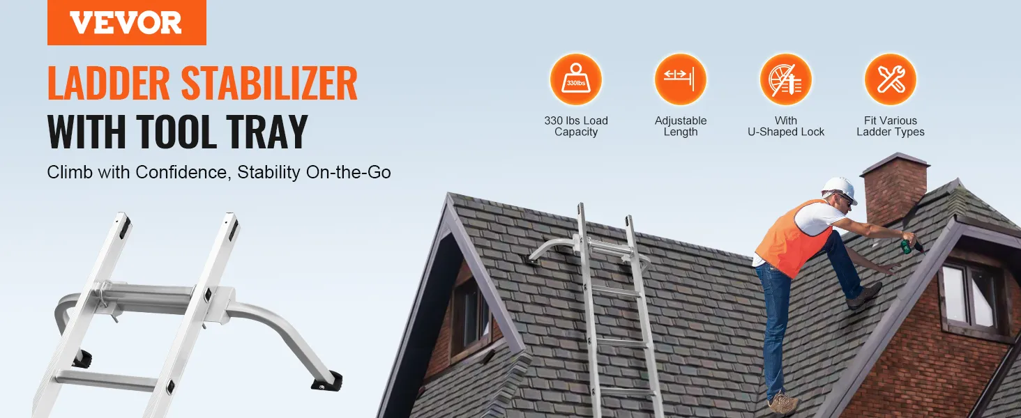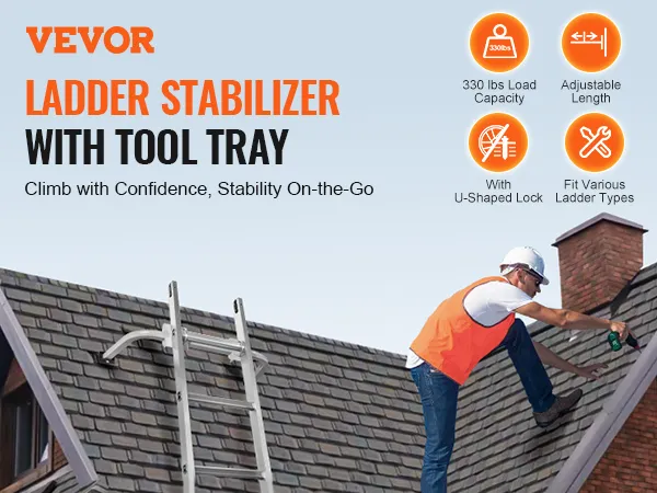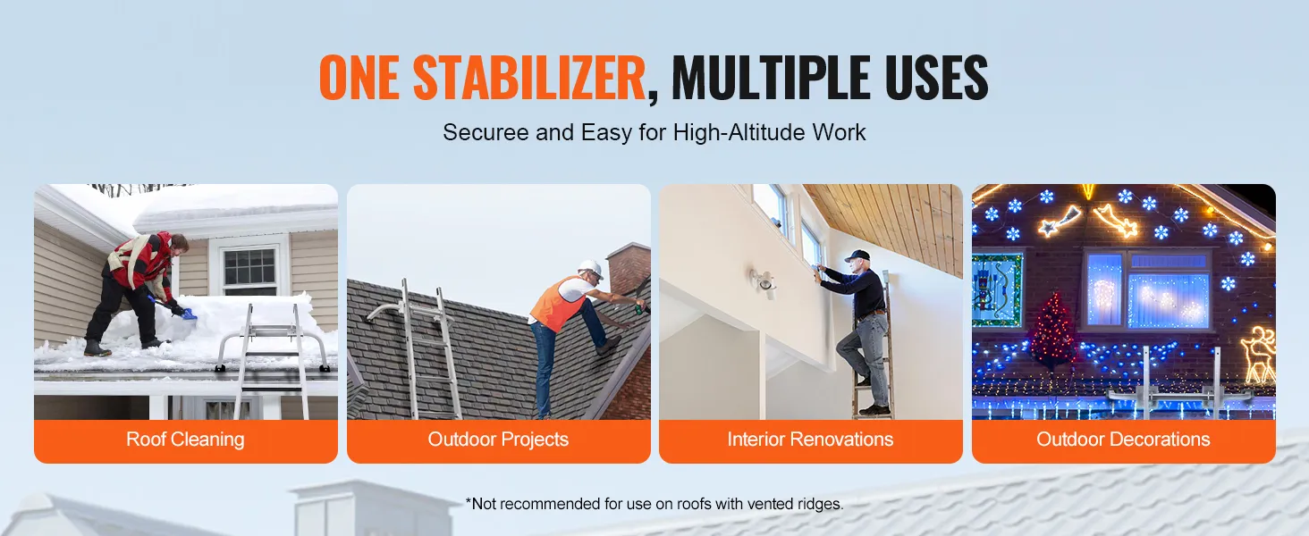 Diseñado para múltiples aplicaciones, nuestro estabilizador de escalera hace que el trabajo a gran altura sea fácil y seguro. Ideal para limpieza de techos, tareas al aire libre, renovaciones interiores y decoraciones exteriores. Nota: No se recomienda para techos con cumbreras ventiladas.