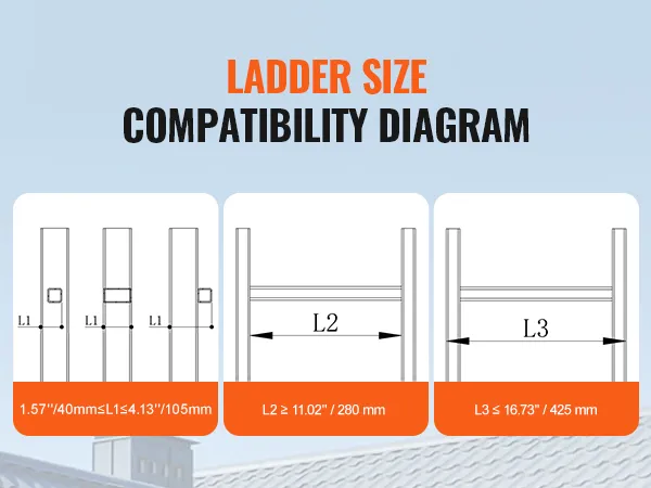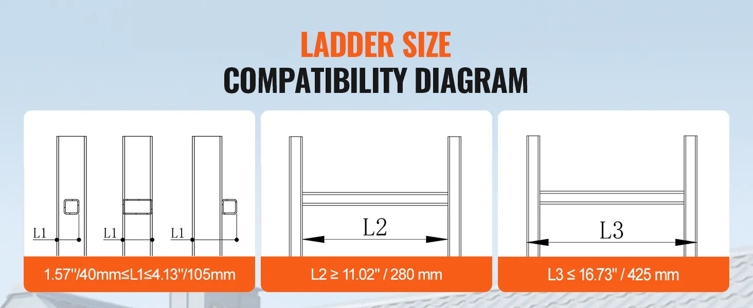 Amplia compatibilidad: se adapta a escaleras con un ancho de ≤16,73'' y una longitud de peldaño de ≥11,02''. Compatible con varios tipos de escaleras: madera, fibra de vidrio o aluminio. Fabricado con acero de alta calidad para una mayor durabilidad y un soporte estable.