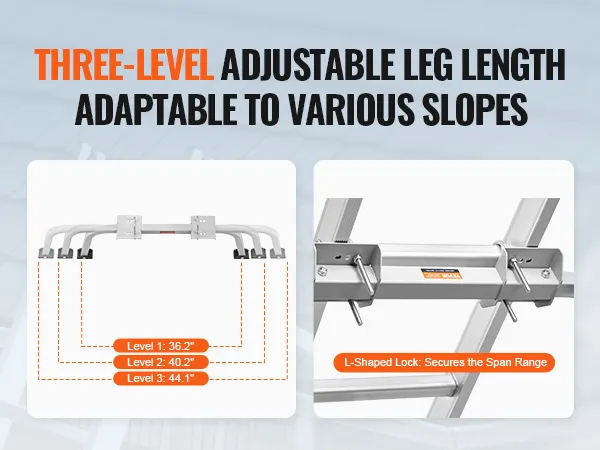 Ajustable en tres posiciones, la longitud de las patas se adapta a distintas inclinaciones para brindar un soporte sólido. Equipado con clips de bloqueo confiables, garantiza seguridad y flexibilidad a cualquier altura o ángulo.