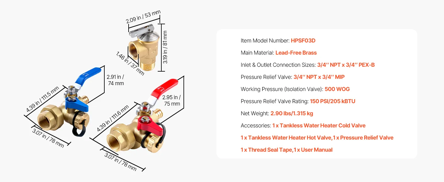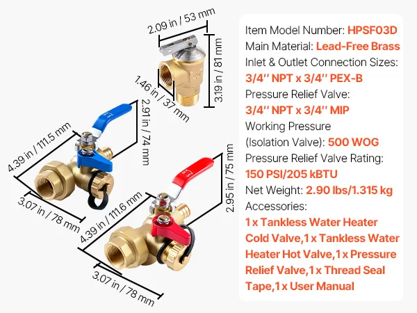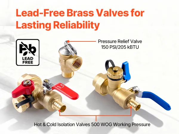 Todos los componentes esenciales en un solo kit: nuestra válvula de servicio de aislamiento para calentador de agua sin tanque incluye válvulas de aislamiento de agua caliente y fría, una válvula de alivio de presión y cinta selladora de roscas. Fabricada con latón sin plomo y acero inoxidable SUS304 para un rendimiento duradero y sin fugas.