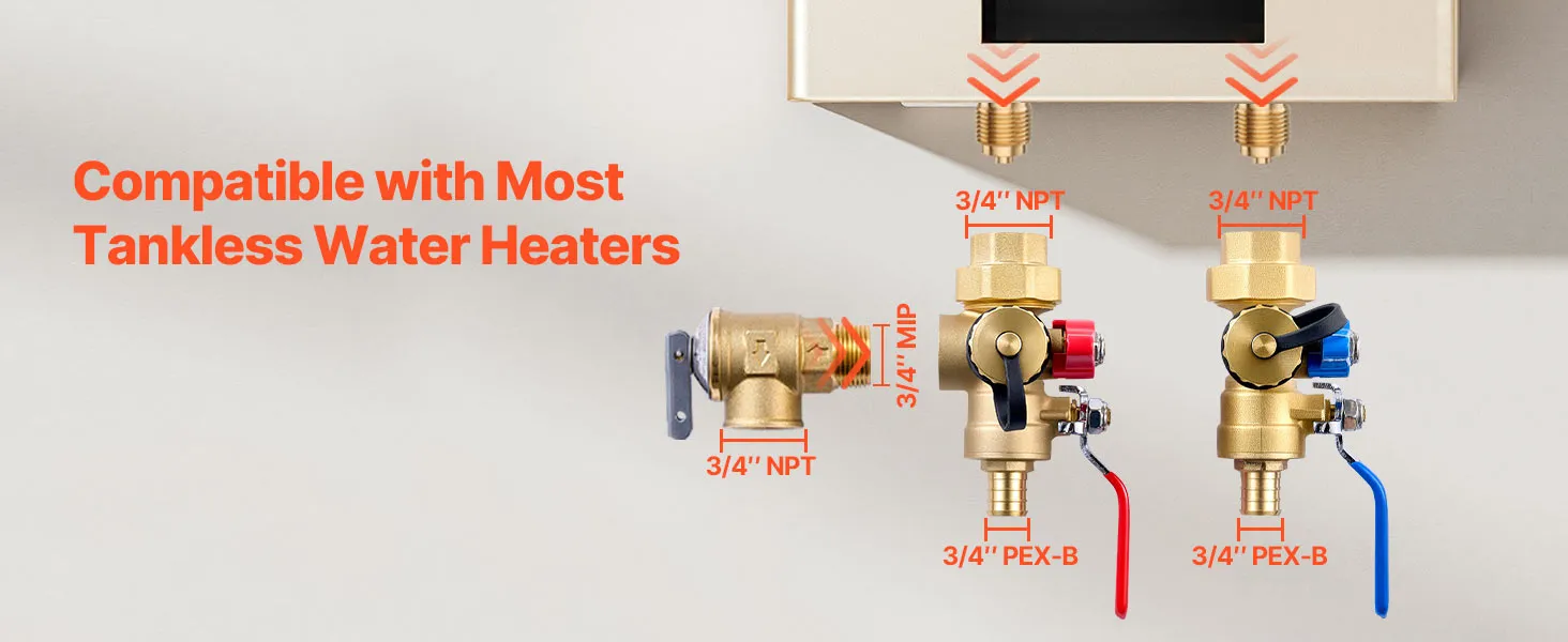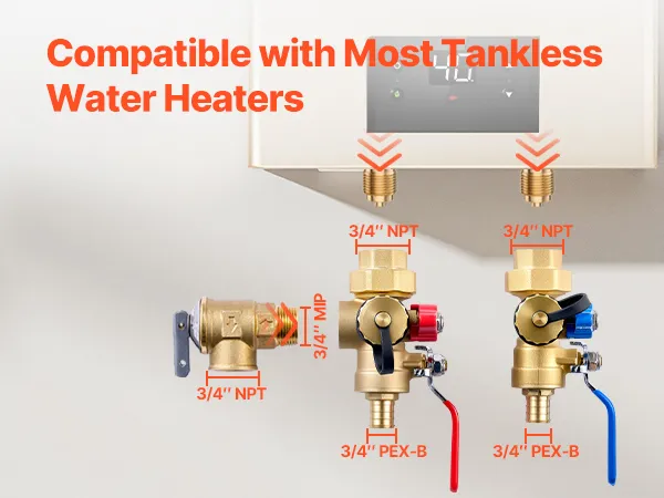 Diseñado con conexiones estándar de 3/4 pulg., este kit de válvula de servicio para calentador de agua sin tanque es compatible con la mayoría de los calentadores de agua sin tanque, lo que hace que la instalación sea más rápida y sencilla sin modificaciones adicionales.
