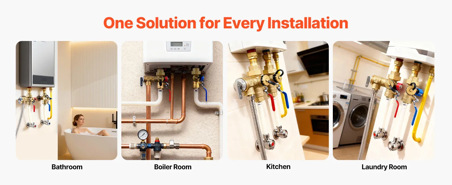 Aplicación en múltiples escenarios: ideal para baños, salas de calderas y cocinas, nuestro kit de válvula de servicio para calentador de agua sin tanque es adecuado tanto para instalaciones de calentadores de agua sin tanque a gas domésticos como comerciales.