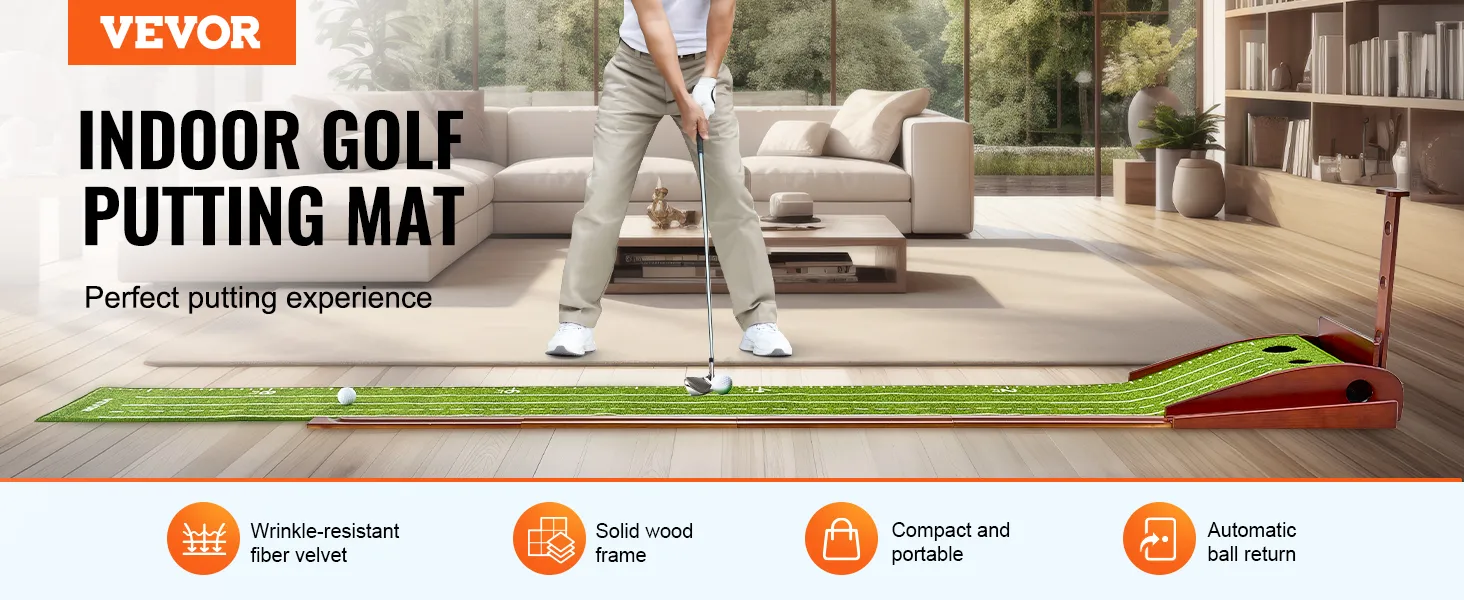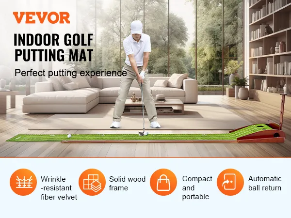 La alfombra de terciopelo de fibra suave y delicada se extiende de forma plana sin arrugas, mientras que el marco de madera maciza y el sistema automático de retorno de la bola garantizan una experiencia de putting suave y continua.