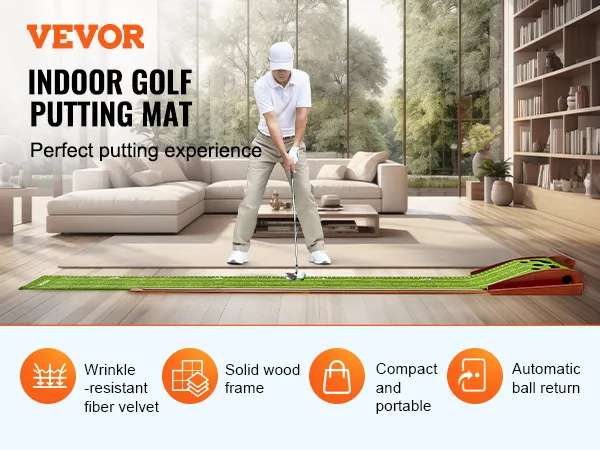 La alfombra de terciopelo de fibra suave y delicada se extiende de forma plana sin arrugas, mientras que el marco de madera maciza y el sistema automático de retorno de la bola garantizan una experiencia de putting suave y continua.