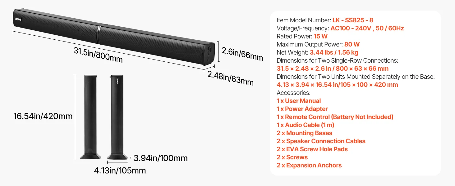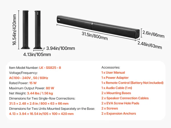 Diseño compacto: Nuestra barra de sonido desmontable 2 en 1 mide 800 x 63 x 66 mm (31,5 x 2,48 x 2,6 pulgadas). Puedes combinar los dos altavoces de torre o separarlos para colocarlos a ambos lados del televisor. Se puede montar en la pared o sobre una mesa.