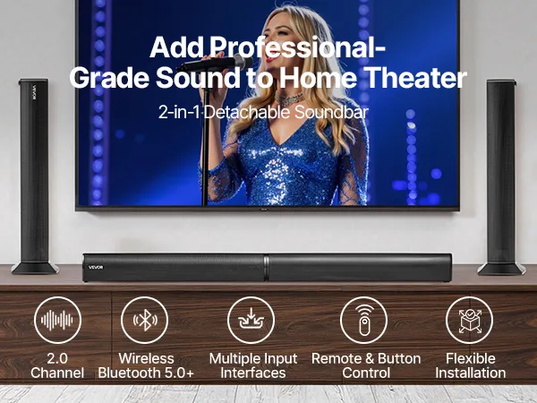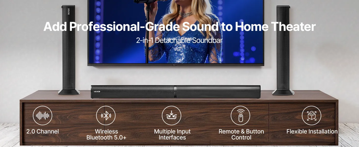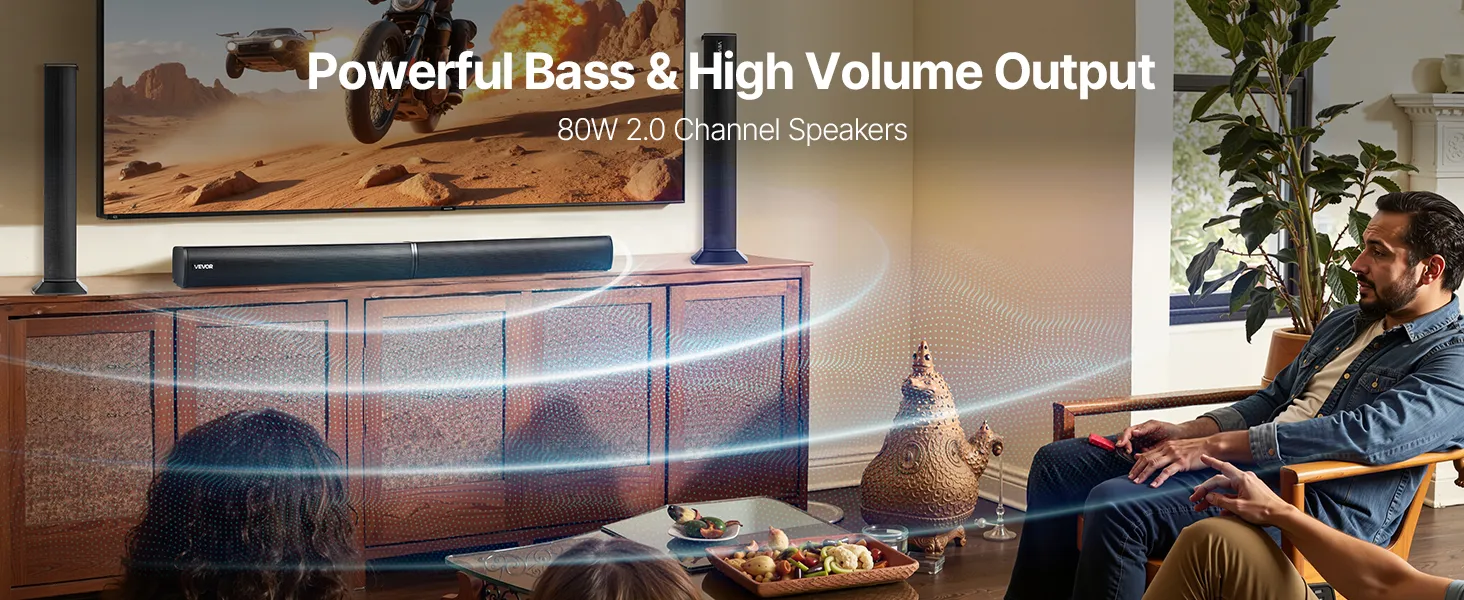 Barra de sonido VEVOR para Smart TV, 2.0 canales, altavoces 2 en 1 desmontables para TV de 32 pulgadas, con conexión Bluetooth, HDMI, AUX y USB, control remoto, sistema de sonido envolvente de 80 W, para cine en casa.