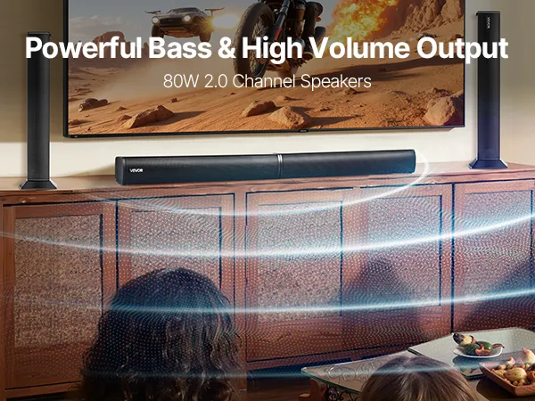 La barra de sonido 2.0 de 80 W para TV cuenta con un diseño de canal izquierdo y derecho que ofrece graves potentes y un volumen alto. Desde efectos de cine impactantes hasta graves profundos para música, ofrece una experiencia auditiva excepcional con un volumen alto y brillante.