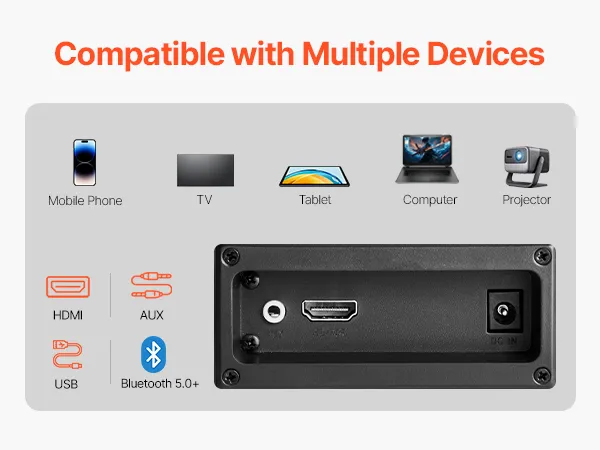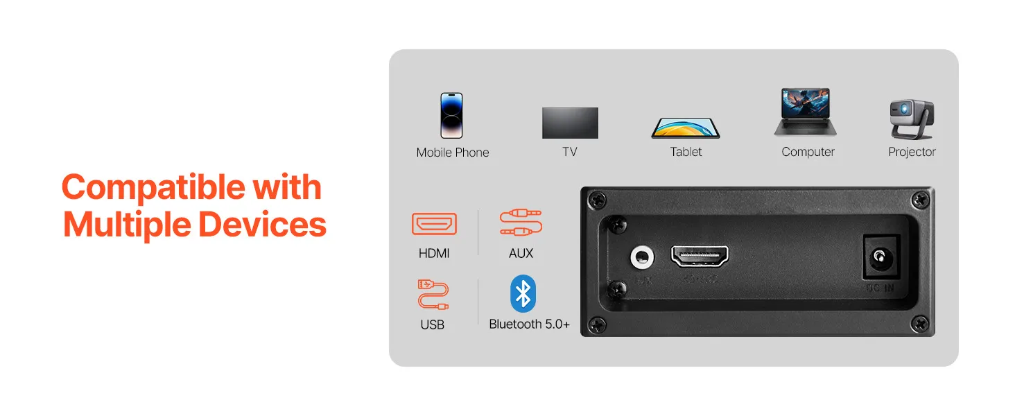 Esta barra de sonido para TV es compatible con conexión inalámbrica Bluetooth 5.0 y conexiones por cable, incluyendo HDMI, AUX y USB. Se conecta perfectamente con teléfonos, televisores, tabletas, computadoras y proyectores, satisfaciendo tus necesidades de audio en diferentes situaciones sin limitaciones de dispositivo.