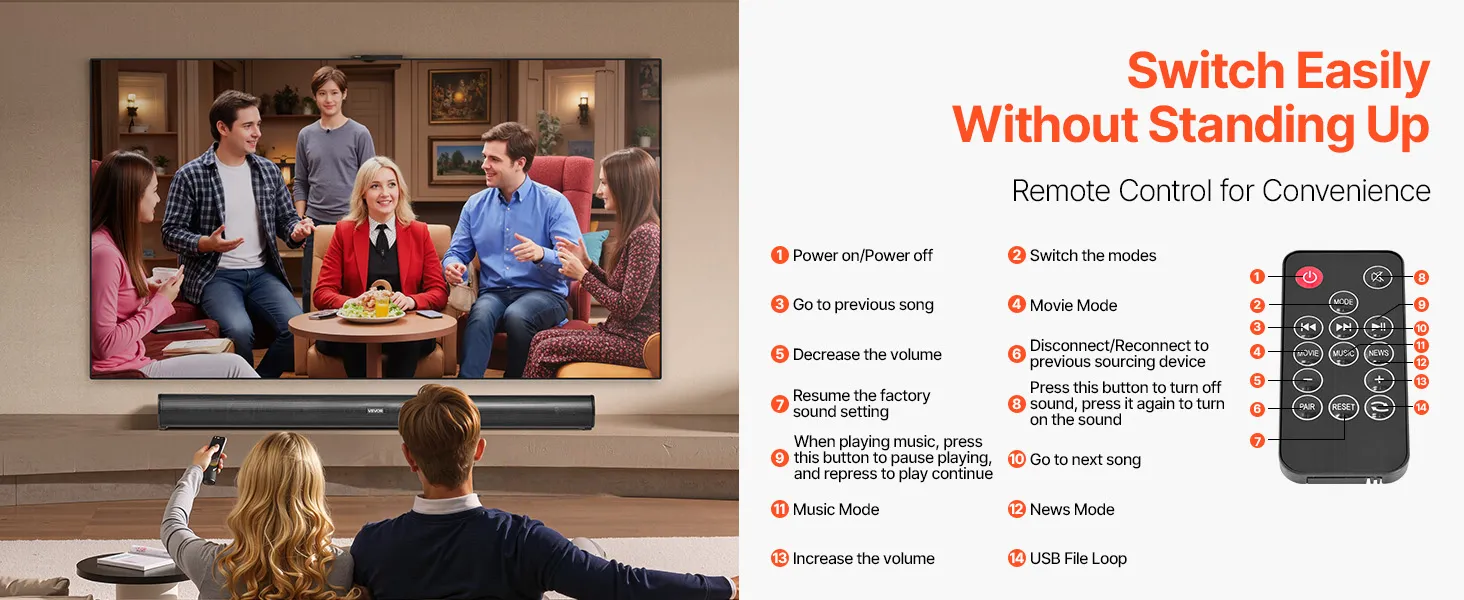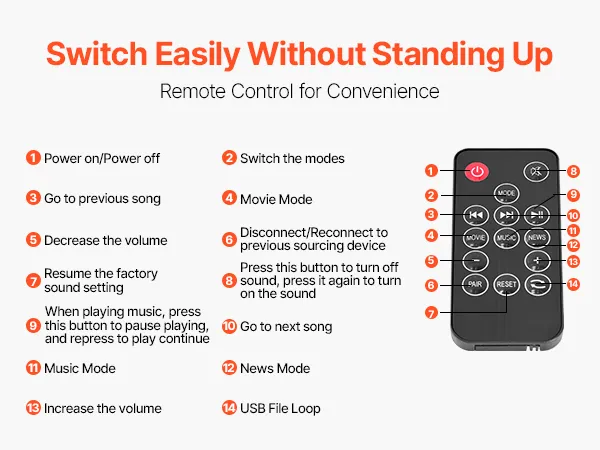 Nuestra barra de sonido para TV incluye un control remoto para cambiar fácilmente sin necesidad de levantarse. Puedes ajustar el volumen, cambiar de modo de sonido o controlar la reproducción/pausa con un solo clic. Permite cambiar fácilmente entre los modos de películas, música y noticias para una experiencia de audio cómoda.