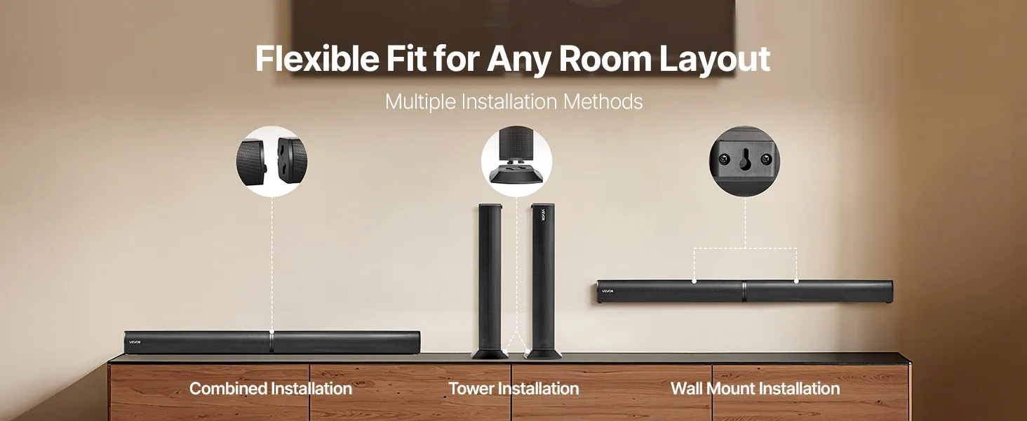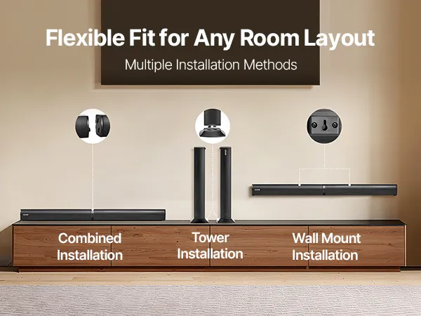 La barra de sonido Bluetooth ofrece múltiples opciones de instalación, como montaje combinado, en torre y en pared. Se adapta fácilmente a diversos espacios, como salas de estar, dormitorios y oficinas, satisfaciendo las necesidades de diseño de diferentes ambientes.
