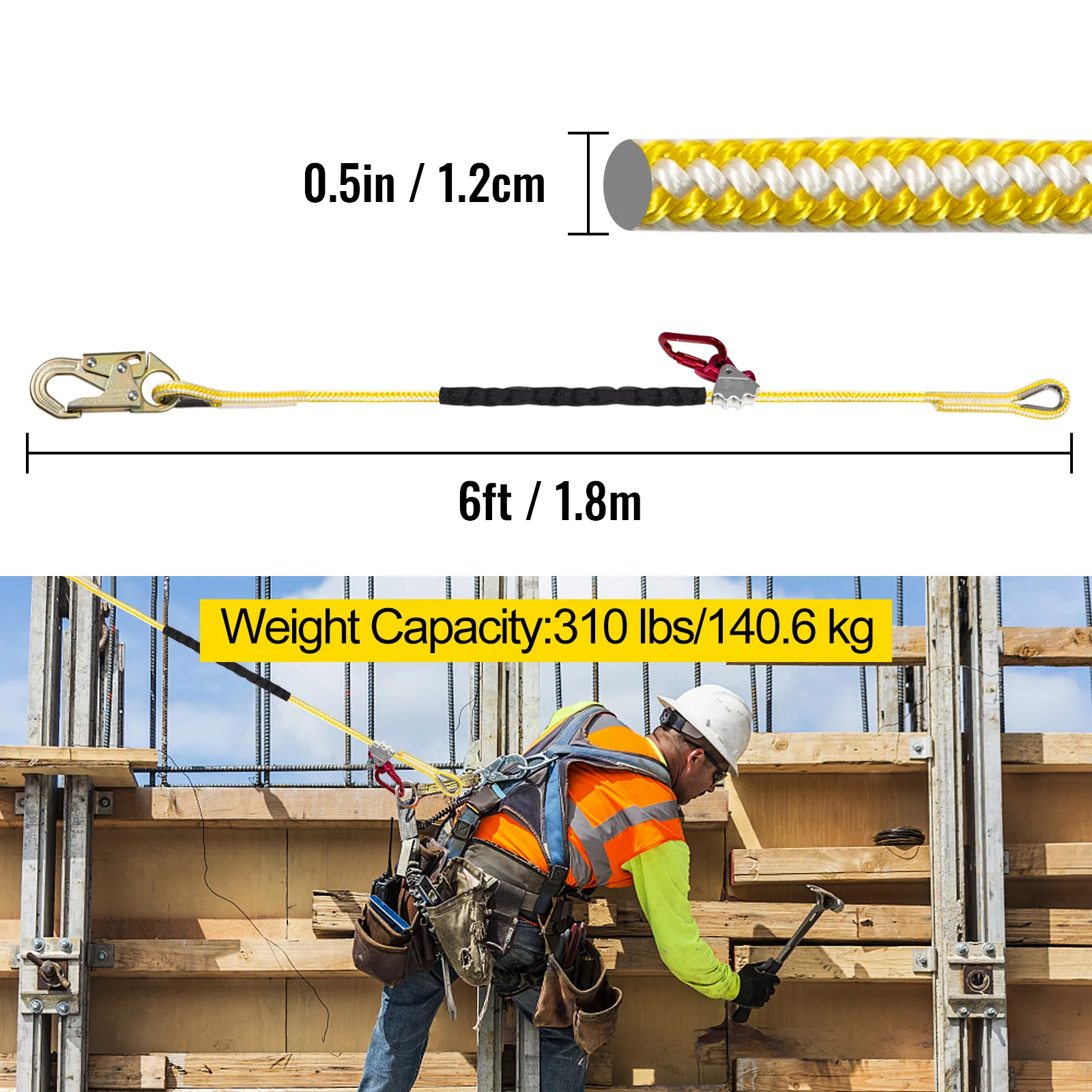 La cuerda de posicionamiento tiene 6 pies de largo y 1/2” de diámetro. La capacidad de peso de 310 libras es suficiente para usted y su equipo, lo que garantiza una alta seguridad en el lugar de trabajo.