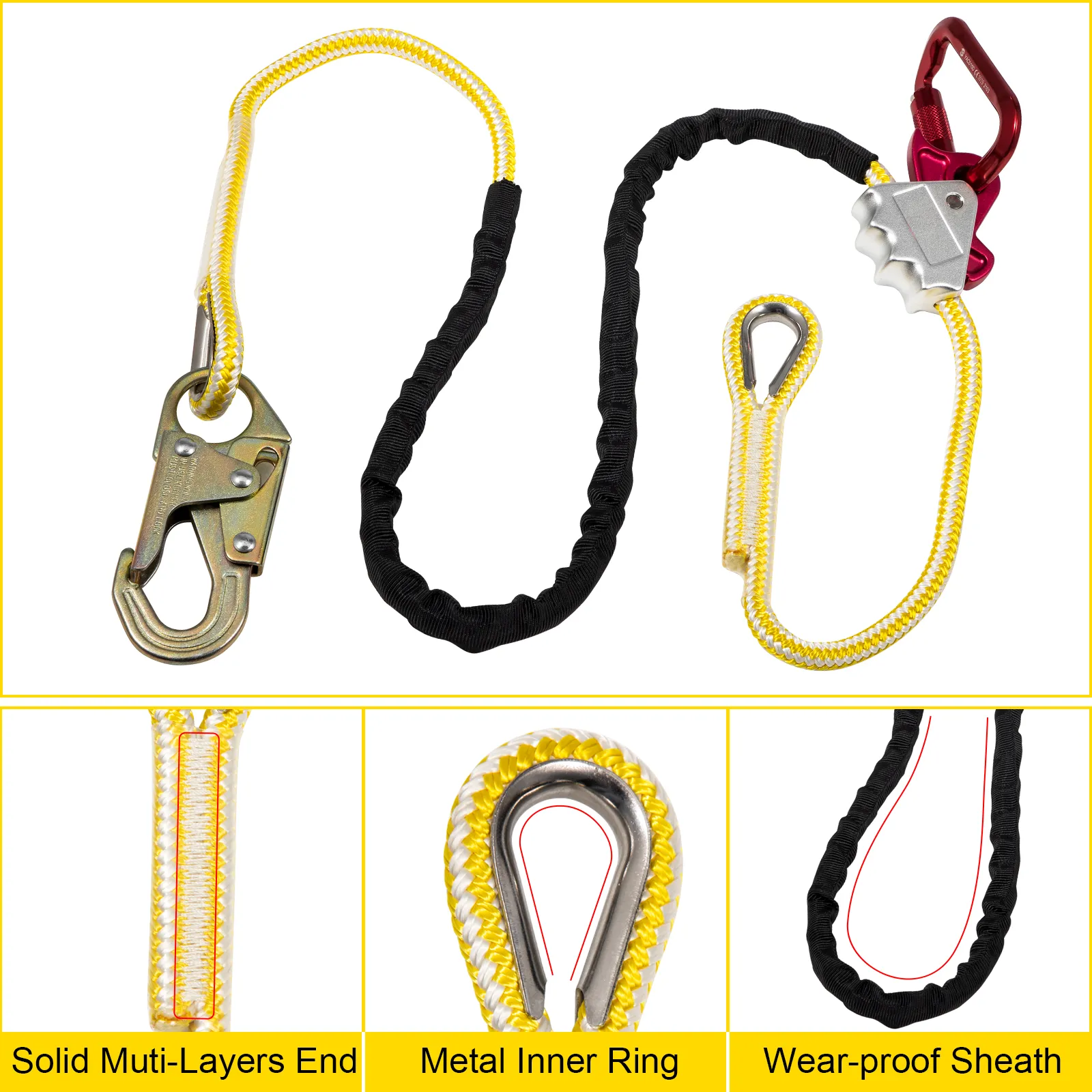 Nuestro cordón de posicionamiento de cuerda ajustable está hecho de poliéster y nailon duraderos, resistente al desgaste para un uso duradero. La cuerda viene con un agarrador de cuerda ajustable, un mosquetón con anilla en D y un mosquetón de acero sólido. Es ideal para garantizar la seguridad de las personas que necesitan trabajar a gran altura.