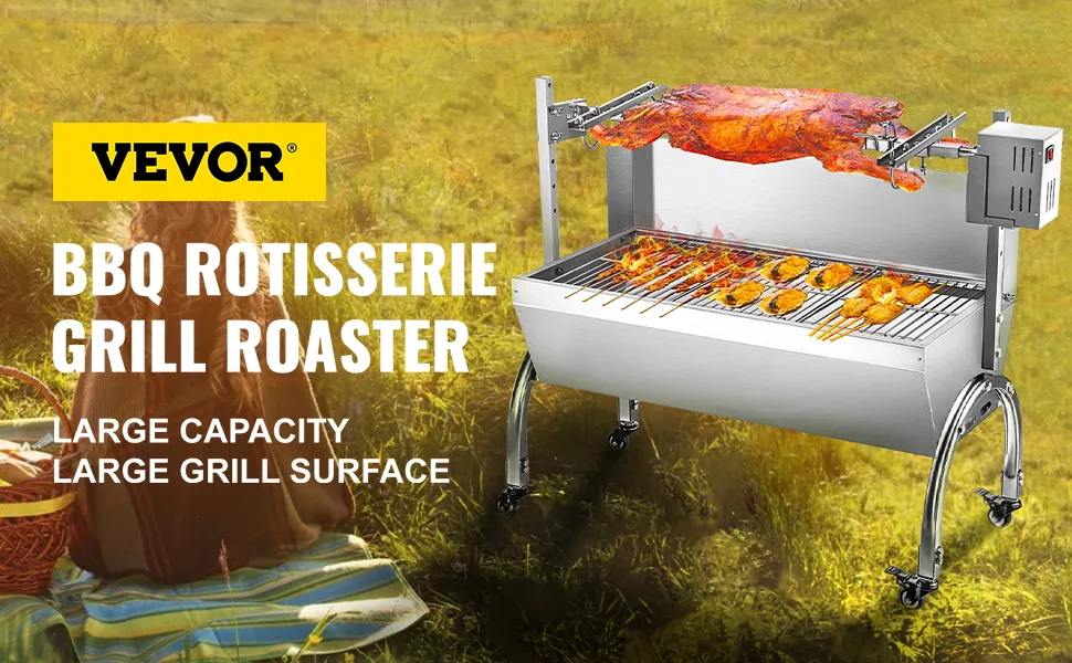 Esta parrilla para asar asador es excelente para uso comercial y doméstico, así como para uso social. fiestas de barbacoa. Ideal para asar caza mayor hasta 132LBS/60KG. El La superficie reflectante del marco de acero inoxidable refleja y enfoca el calor de las brasas a la carne. El tenedor para asar duro puede soportar muchas piezas de carne para que pueda disfrutar de más sabor al mismo tiempo.