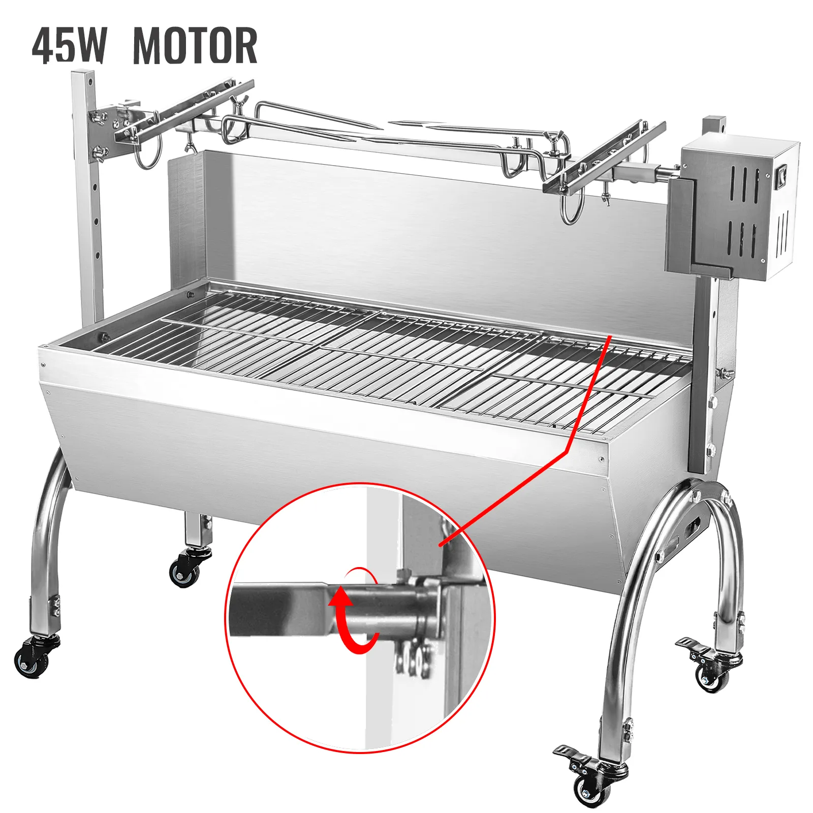 El potente motor eléctrico de 45 W hace que el asador gire alrededor de 4 revoluciones por minuto. Tú puede estar seguro de asar pollos enteros, cerdo, cabra o cordero. Velocidad del motor: 4 RPM