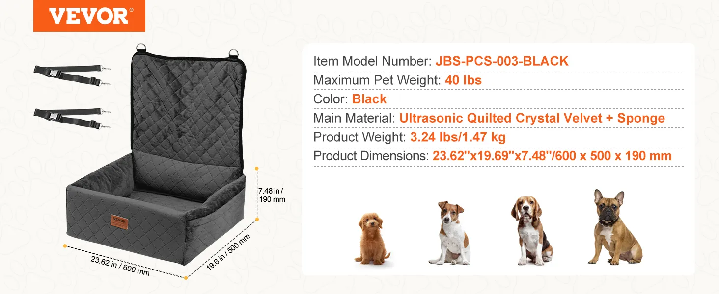 Asiento de coche para perros VEVOR, asiento elevador para coche con bolsillo de almacenamiento, correa de seguridad con clip, relleno de esponja y algodón PP, cama para perros pequeños y medianos de hasta 18 kg, color negro