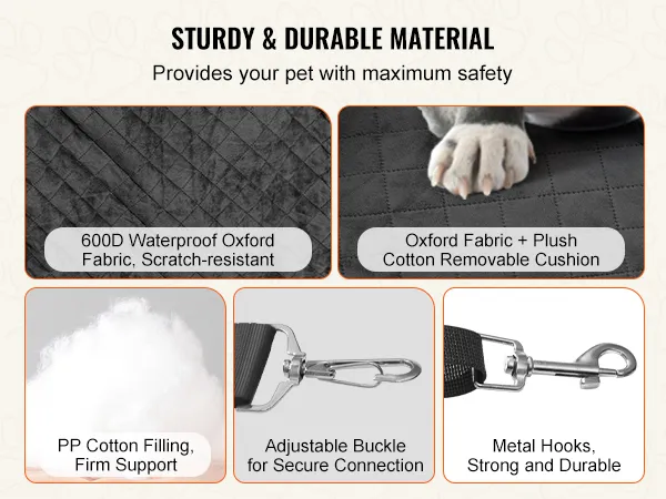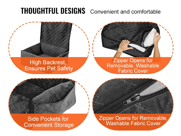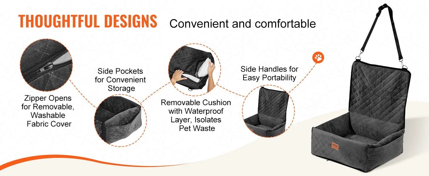 Diseño práctico y conveniente: el asiento para mascotas para el automóvil cuenta con un gran bolsillo lateral para guardar los artículos esenciales de la mascota y un respaldo extendido para mayor seguridad durante el frenado. La almohadilla extraíble con una capa impermeable en la parte inferior evita que los desechos de la mascota se filtren y facilita la limpieza.