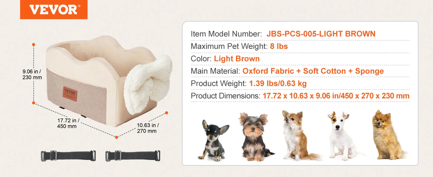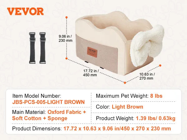 Asiento de coche para perros VEVOR con consola central, asiento elevador para perros pequeños, asiento para mascotas con reposabrazos, correa con clip, correas ajustables, soporta hasta 3,6 kg, marrón claro
