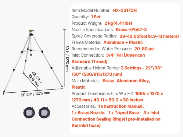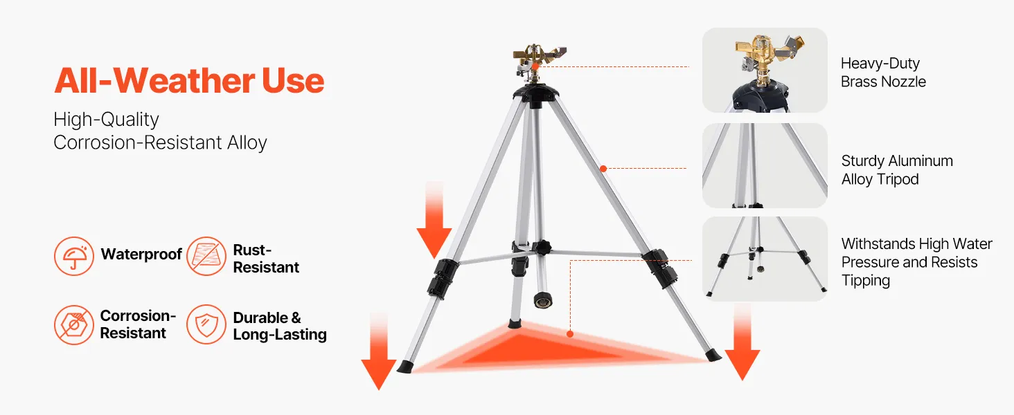 High-Quality Materials: Made of heavy-duty brass, the garden sprinkler is sturdy, waterproof, rust-resistant, and corrosion-resistant for long-term use. The tripod is made of aluminum and plastic, ensuring durability. Its structure remains stable even under high water pressure.