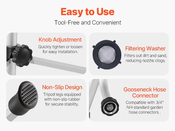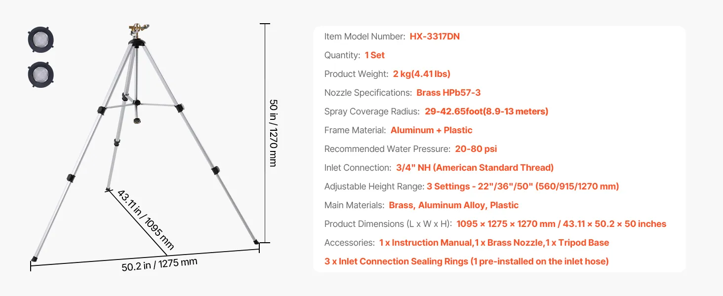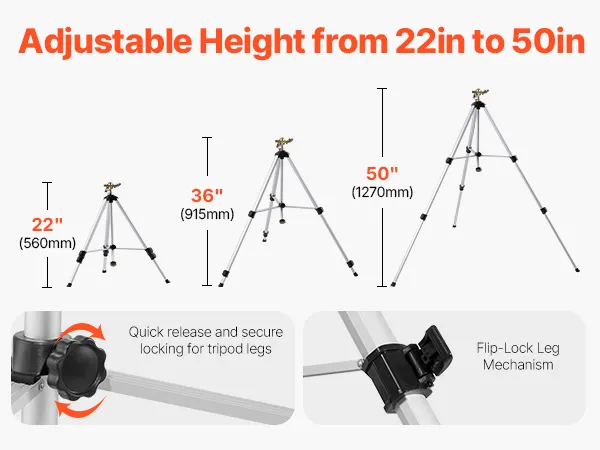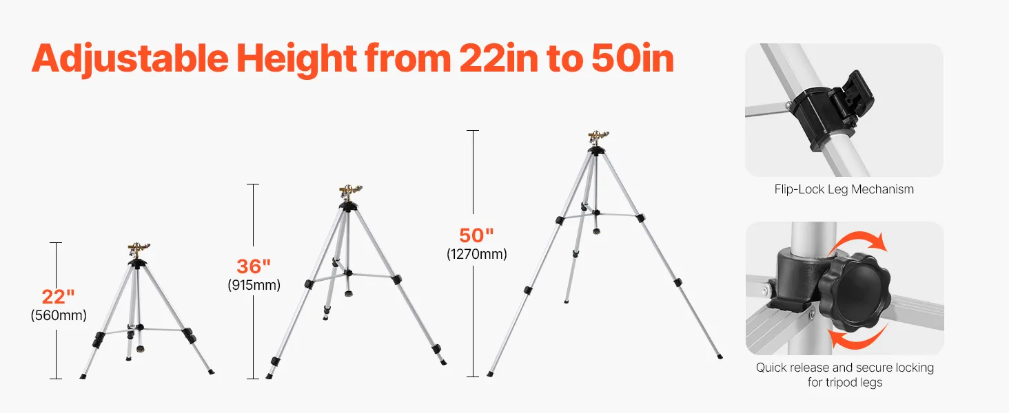 Three-Level Adjustable Height: The tripod stand offers three adjustable heights: 22/36/50 in (560/915/1270 mm). The stand features quick-lock leg adjustments to accommodate different irrigation heights, avoiding obstruction by shrubs or other obstacles.