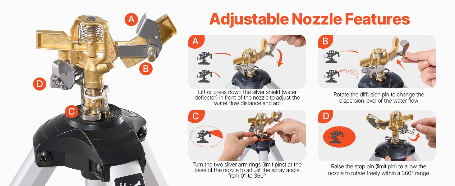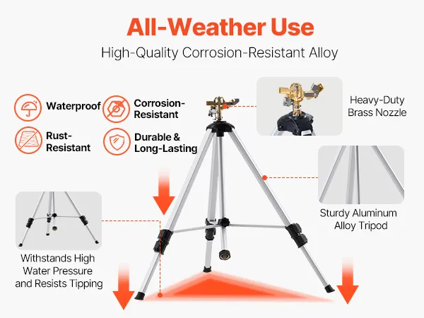 Combining a quality brass sprinkler head with a tripod, this sprinkler is waterproof, rust-resistant for long-lasting use. It irrigates areas up to 5539 sq. ft, enhancing irrigation efficiency. The adjustable head, leg locks, and 3-level height adjustment make installation and operation easy!