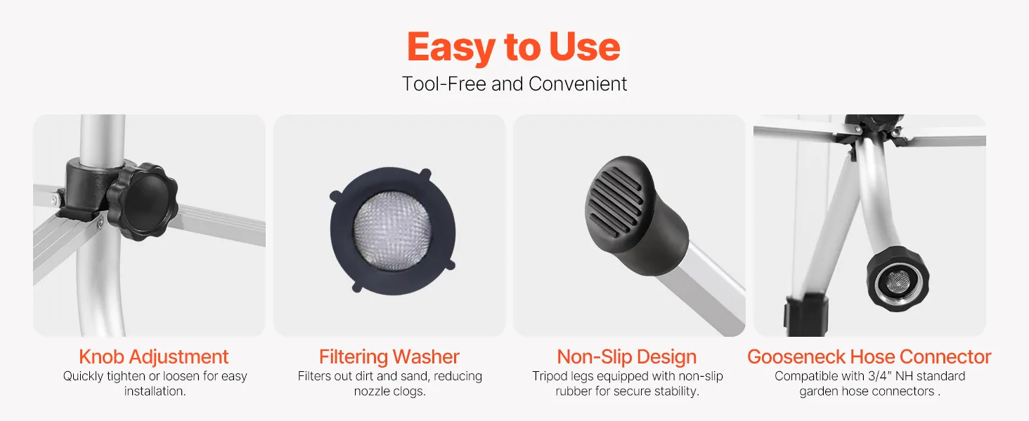 Easy to Use: The gooseneck hose easily connects to a 3/4" US standard garden hose. This impact sprinkler on tripod base is equipped with a rubber filter O-ring to filter sand and gravel, preventing nozzle clogging. Simple installation and easy to use.