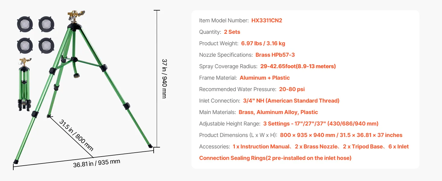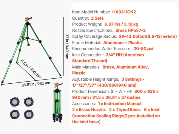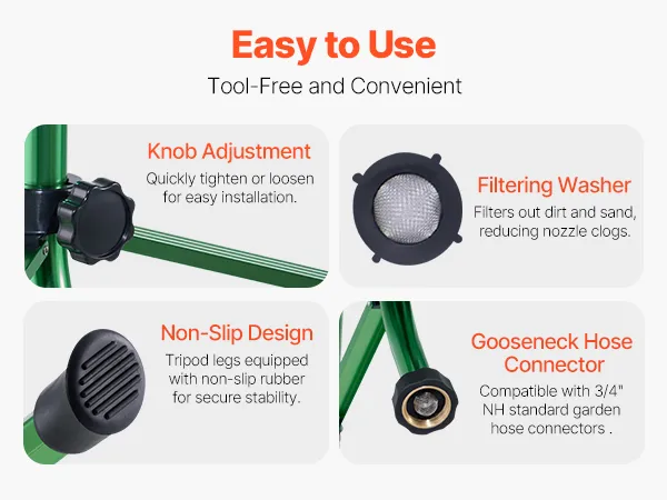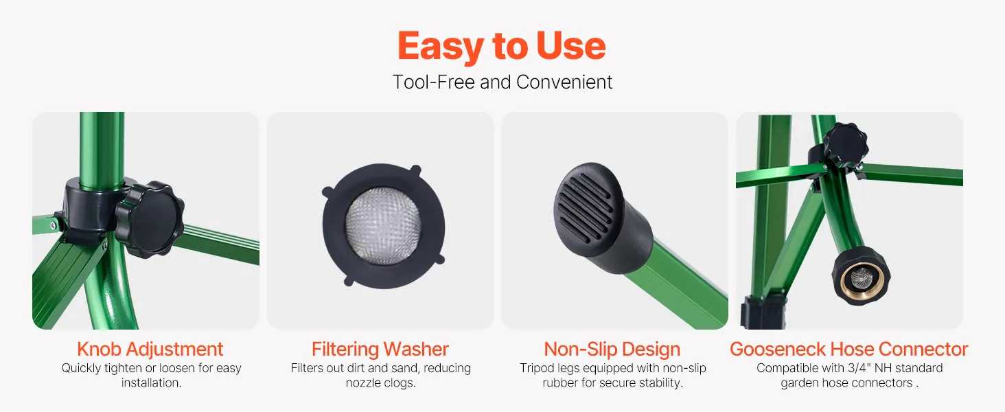Easy to Use: The gooseneck hose easily connects to a 3/4" US standard garden hose. This sprinkler on tripod base is equipped with a rubber filter O-ring to filter sand and gravel, preventing nozzle clogging. Simple installation and easy to use.