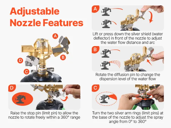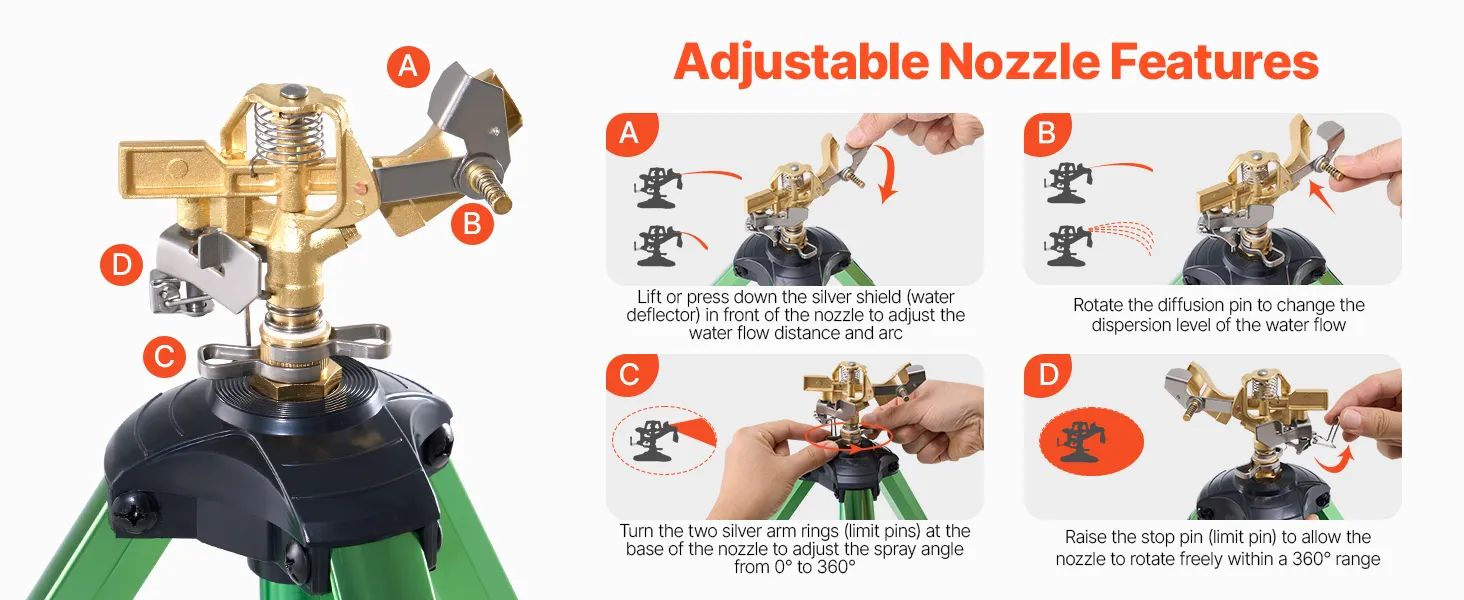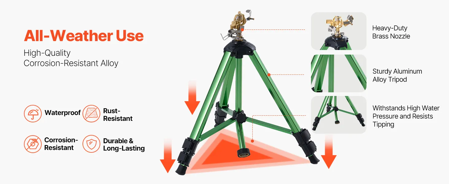 Combining a quality brass sprinkler head with a tripod, this sprinkler is waterproof, rust-resistant for long-lasting use. It irrigates areas up to 5539 sq. ft, enhancing irrigation efficiency. The adjustable head, leg locks, and 3-level height adjustment make installation and operation easy!