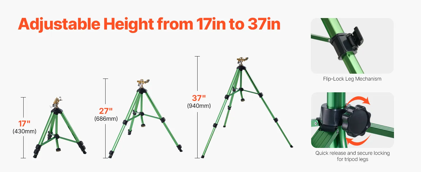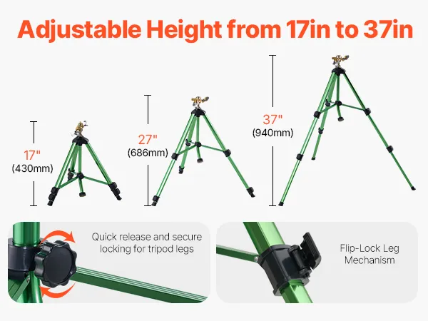Three-Level Adjustable Height: The tripod stand offers three adjustable heights: 17/27/37 in (430/686/940 mm). The stand features quick-lock leg adjustments to accommodate different irrigation heights, avoiding obstruction by shrubs or other obstacles.