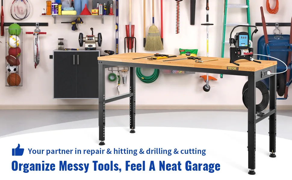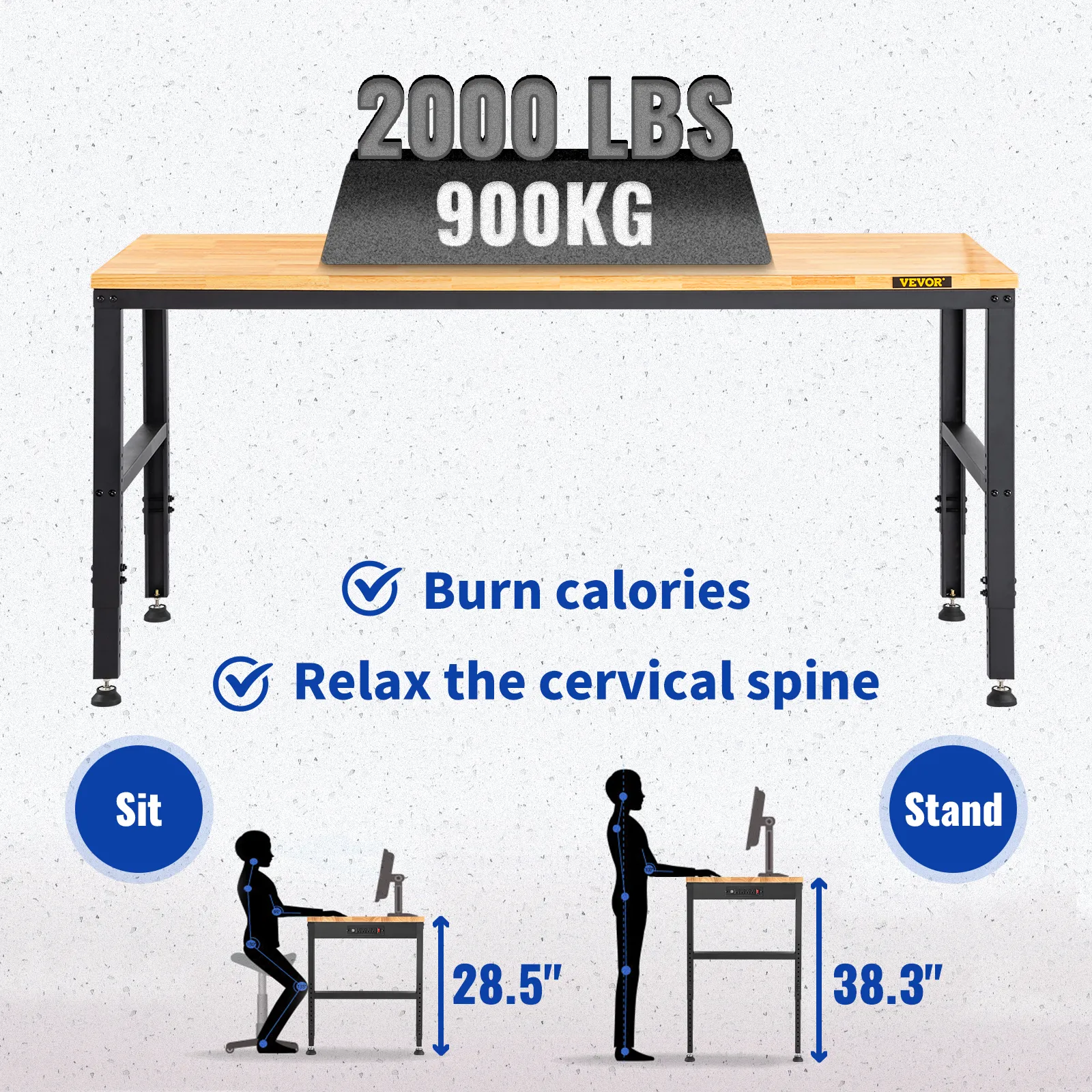 VEVOR Banco de trabajo de altura ajustable, mesa de garaje de 53\" LX 18\" WX 38.3\" H con alturas de 28.5\" - 38.3\" y capacidad de carga de 2000 LBS, con tomas de corriente, tapa de madera dura, mar