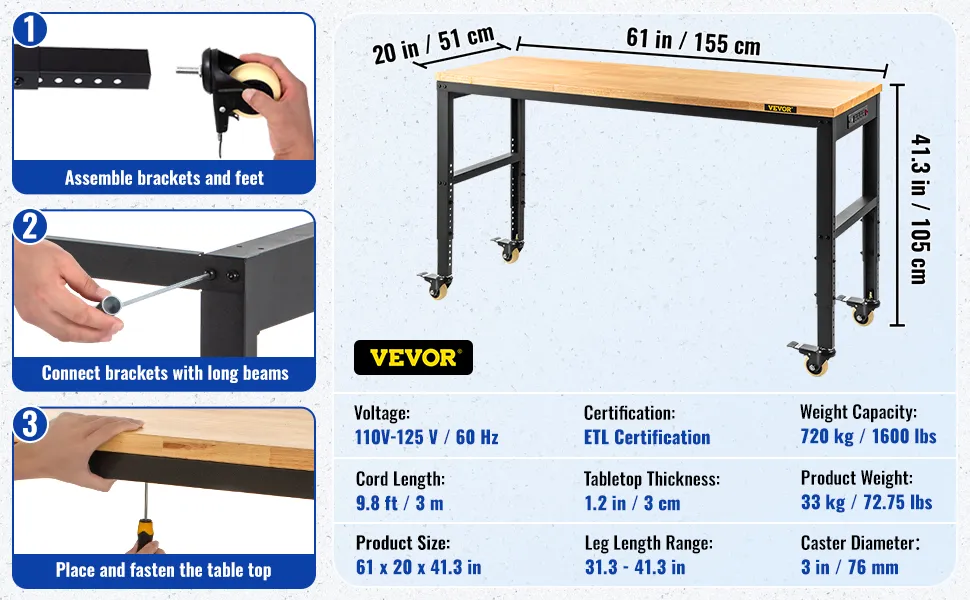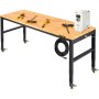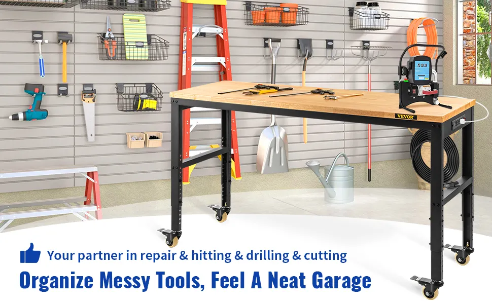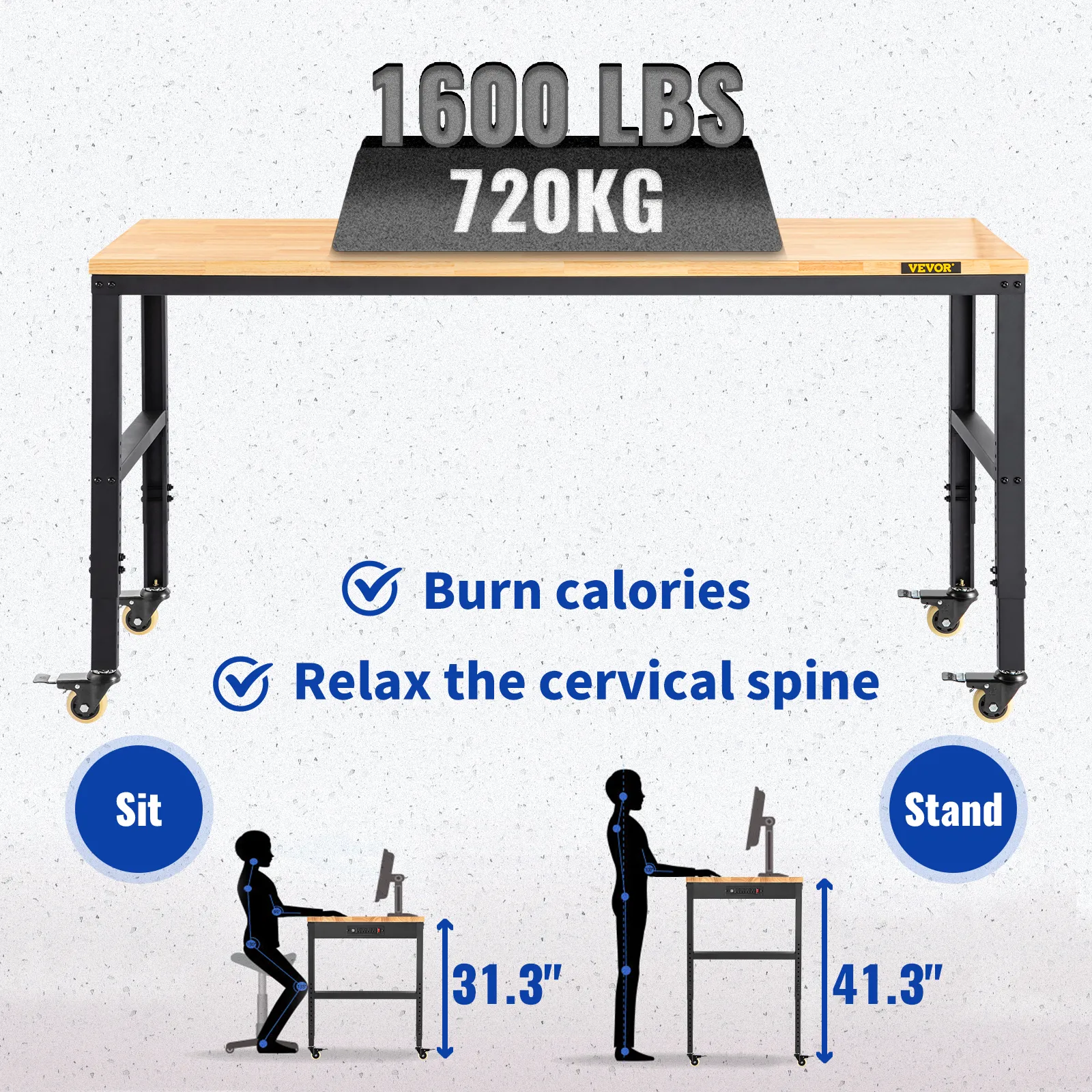 VEVOR Banco de trabajo de altura ajustable, mesa de garaje de 61 x 20 pulgadas con alturas de 31,3 a 41,3 pulgadas y capacidad de 1600 libras, tomas de corriente y parte superior de madera dura y marco de metal y ruedas giratorias, para taller, oficina, hogar