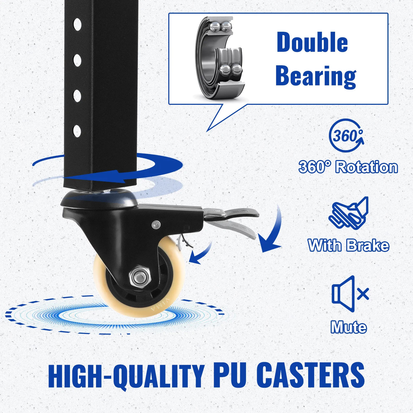 Moverse por cualquier lugar: 4 ruedas giratorias de PU dotan a la mesa de trabajo de una mayor maniobrabilidad. Puede mover fácilmente la mesa a cualquier ubicación designada sin sudar. Cuando quiera trabajar en el banco de trabajo, solo necesita presionar el freno ligeramente para bloquearlo firmemente.