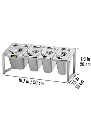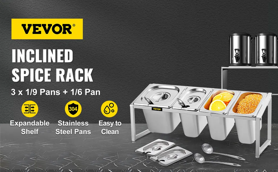 - Este especiero inclinado de 1 nivel consta de un marco expandible (13,8"/35 cm a 23,6"/60 cm ajustable), tres sartenes de 1,6 cuartos de galón y 1/9 y una sartén de 2,6 cuartos de galón de 1/6. Todas las piezas adoptan acero inoxidable para un uso duradero. La estructura simple hace que sea fácil de armar y que ahorre espacio para guardar. Seguro que será su ayudante de cocina confiable, organizando bien la encimera y manteniendo su cocina limpia y ordenada. Mantenga las cosas dentro de un rango de fácil acceso y condimente su espacio de trabajo con nuestro especiero inclinado.