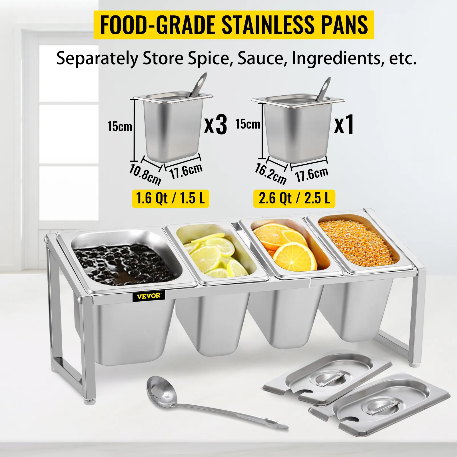 Puede poner varios ingredientes y materiales en los recipientes, como condimentos, especias, salsas, mermelada, sopa dulce, granos de café, frutas, verduras, etc. Este especiero extensible es adecuado para cocinas domésticas o comerciales, cafeterías, tiendas de bebidas, restaurantes, etc