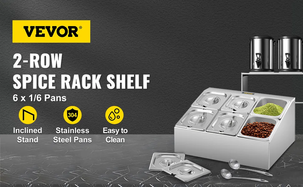 - Este estante para especias de 2 filas consta de un marco inclinado y seis sartenes de 1/6 de 2,6 cuartos de galón. Todas las piezas adoptan acero inoxidable para un uso duradero. La estructura simple hace que sea fácil de quitar y limpiar. Seguro que será su ayudante de cocina confiable, organizando bien la encimera y manteniendo su cocina limpia y ordenada. Mantenga sus condimentos e ingredientes preferidos al alcance de la mano. Te encantará nuestro especiero y tu cocina te encantará.