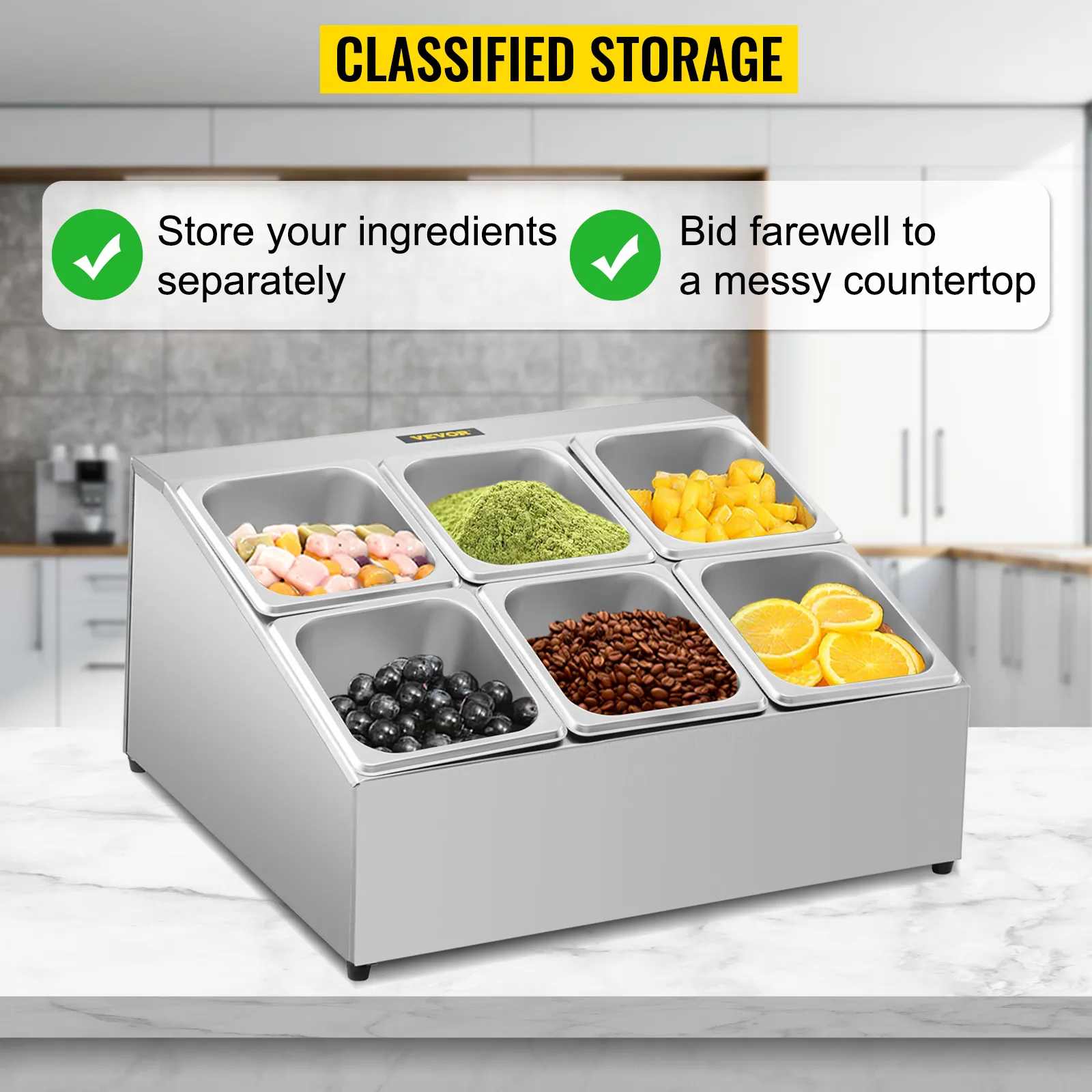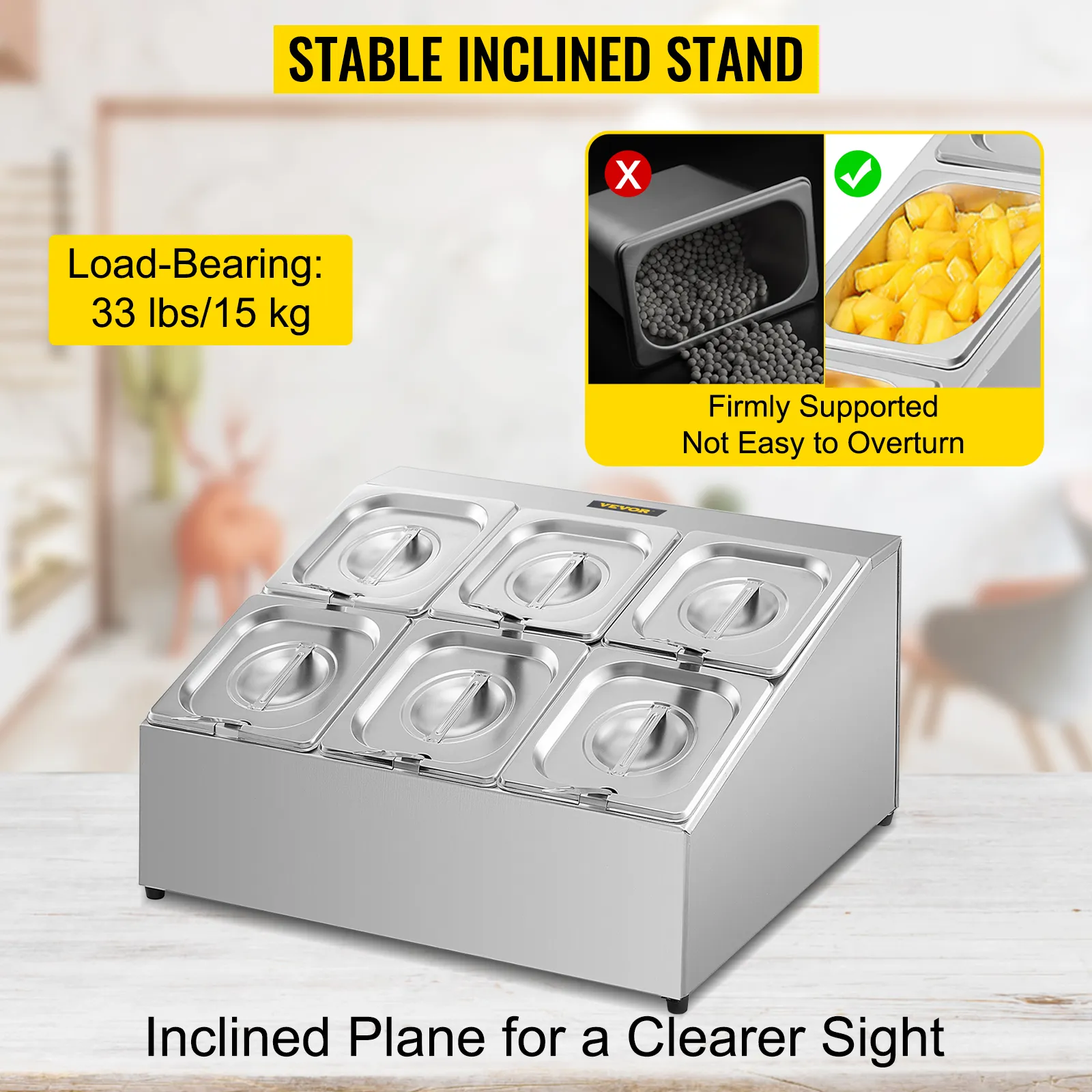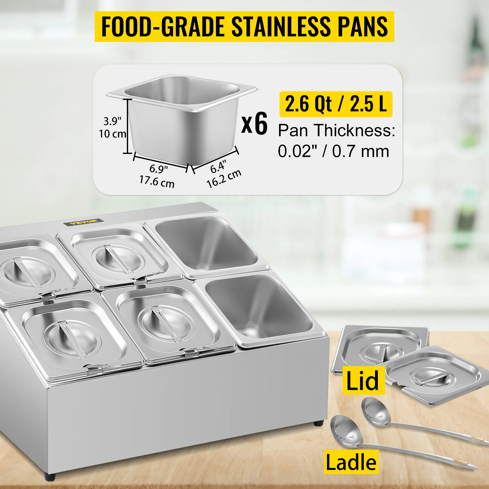 Este puesto de especias viene con seis recipientes para alimentos de 1/6, hechos de acero inoxidable 304 apto para uso alimentario, perfectos para almacenarlos por separado. Dimensiones de la bandeja de 1/6: 6,9"x6,4"x3,9"/17,6x16,2x10 cm; Capacidad: 2,6 Qt/2,5 L; Espesor: 0,02"/0,7 mm. Cada sartén viene con una tapa y un cucharón.