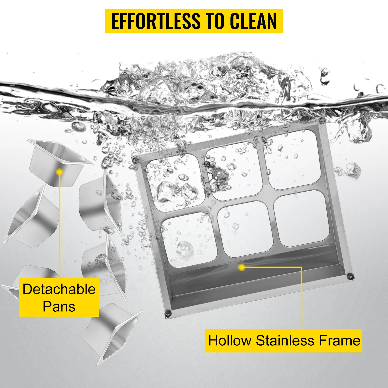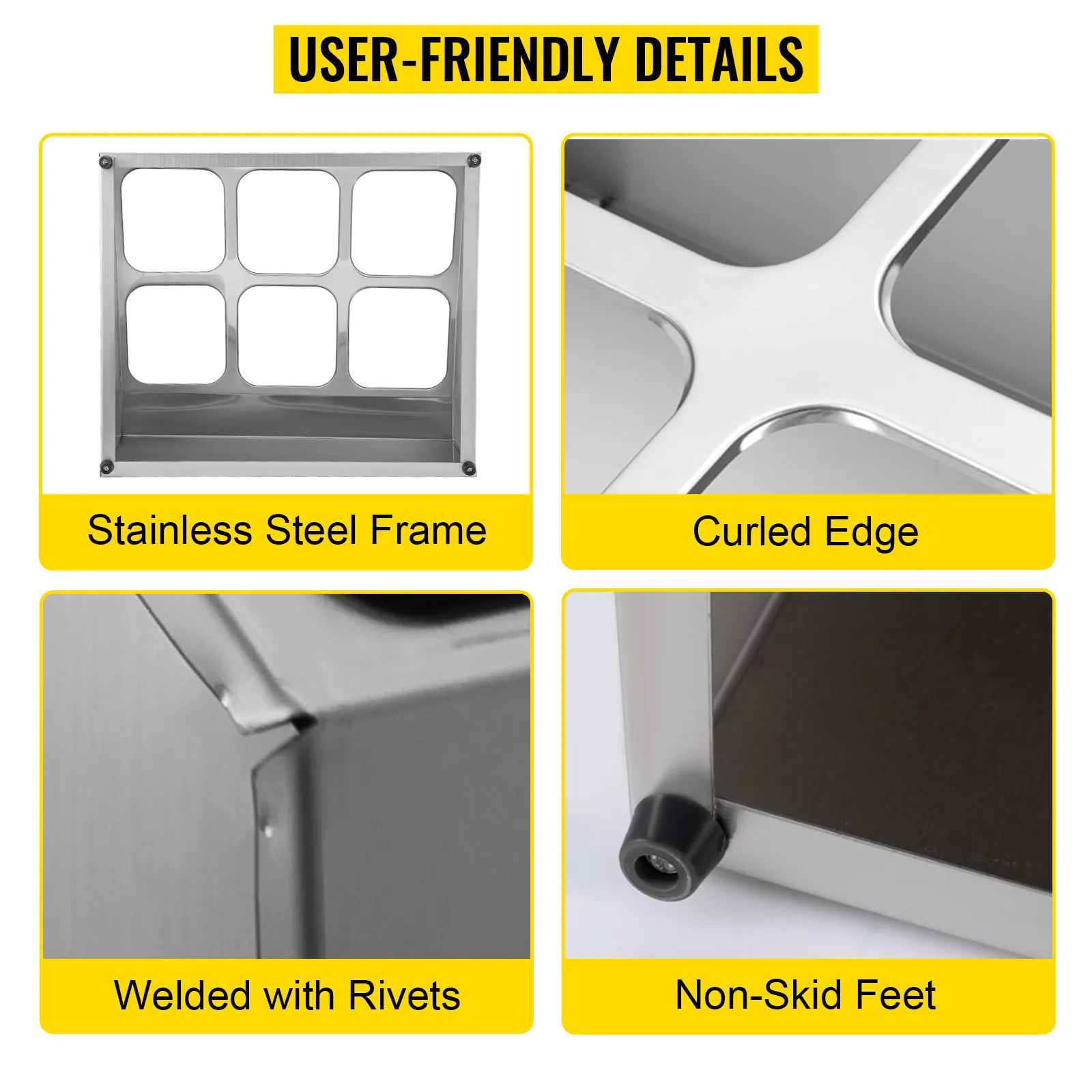 Todos los recipientes para alimentos son desmontables, fáciles de sacar y fáciles de limpiar a fondo. El marco adopta acero inoxidable duradero. La superficie se puede limpiar con un paño húmedo o lavar con agua. El fondo es hueco; no quedará suciedad ni manchas después de la limpieza.