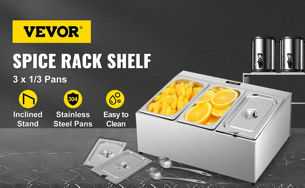 - Este estante para especias de 1 fila consta de un marco inclinado y tres sartenes de 1/3 de 4,2 cuartos de galón. Todas las piezas adoptan acero inoxidable para un uso duradero. La estructura simple hace que sea fácil de quitar y limpiar. Seguro que será su ayudante de cocina confiable, organizando bien la encimera y manteniendo su cocina limpia y ordenada. Mantenga sus condimentos e ingredientes preferidos al alcance de la mano. Te encantará nuestro especiero y tu cocina te encantará.
