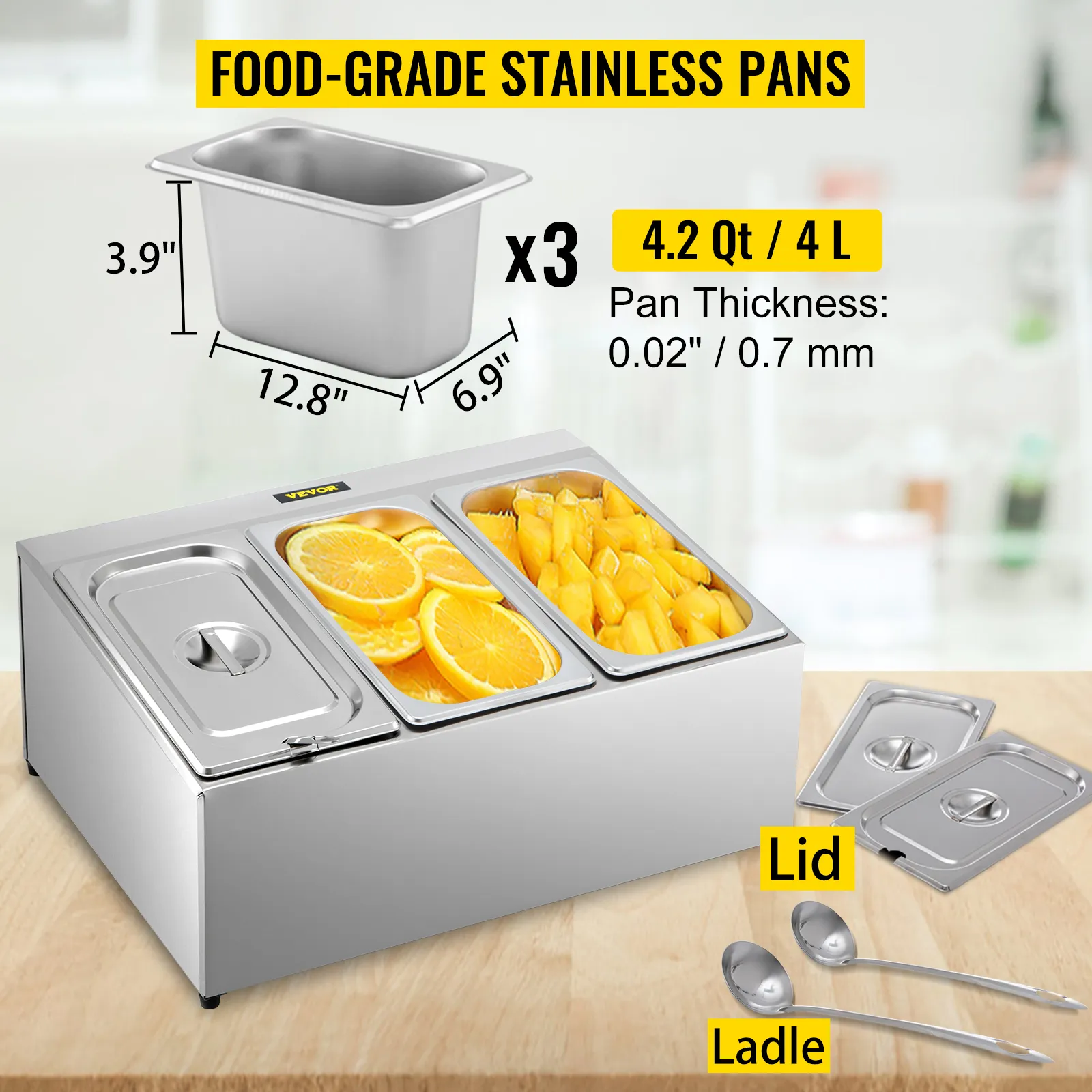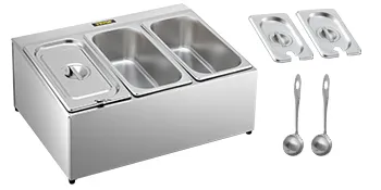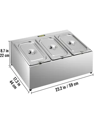 Este puesto de especias viene con tres recipientes para alimentos de 1/3, hechos de acero inoxidable 304 apto para uso alimentario, perfectos para almacenarlos por separado. Dimensiones de 1/3 de bandeja: 12,8"x6,9"x3,9"/32,5x17,6x10 cm; Capacidad: 4,2 Qt/4 L; Espesor: 0,02"/0,7 mm. Cada sartén viene con una tapa y un cucharón.