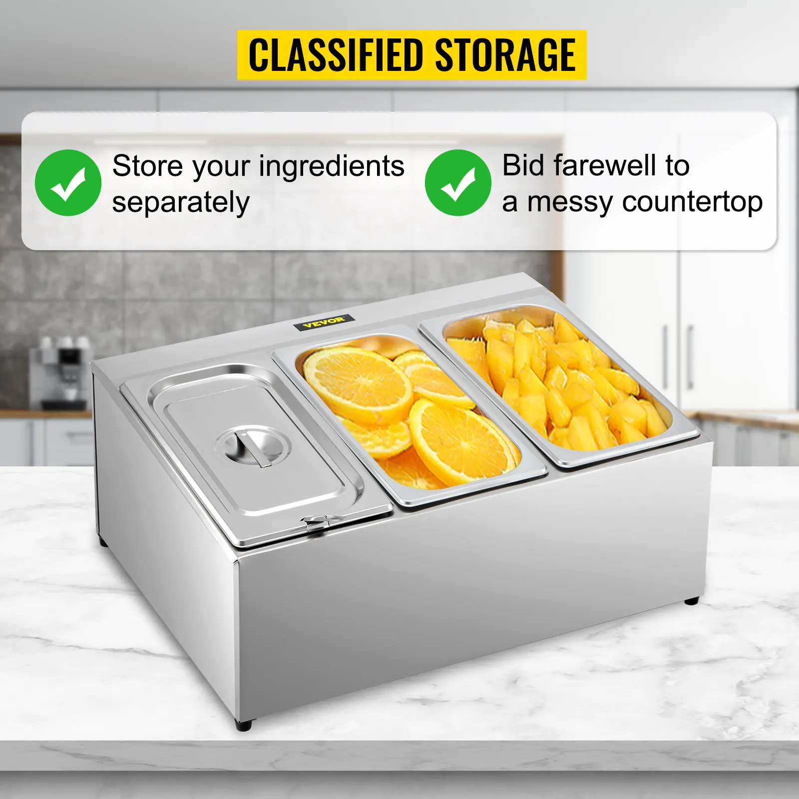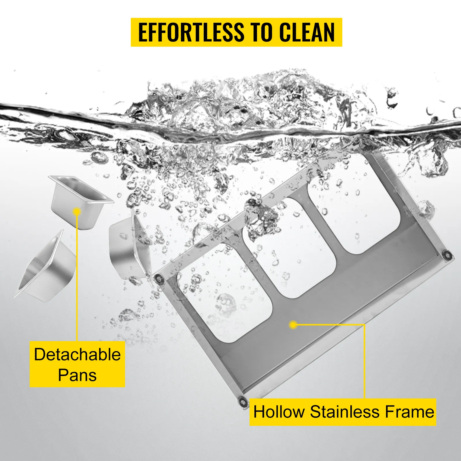Todos los recipientes para alimentos son desmontables, fáciles de sacar y fáciles de limpiar a fondo. El marco adopta acero inoxidable duradero. La superficie se puede limpiar con un paño húmedo o lavar con agua. El fondo es hueco; no quedará suciedad ni manchas después de la limpieza.
