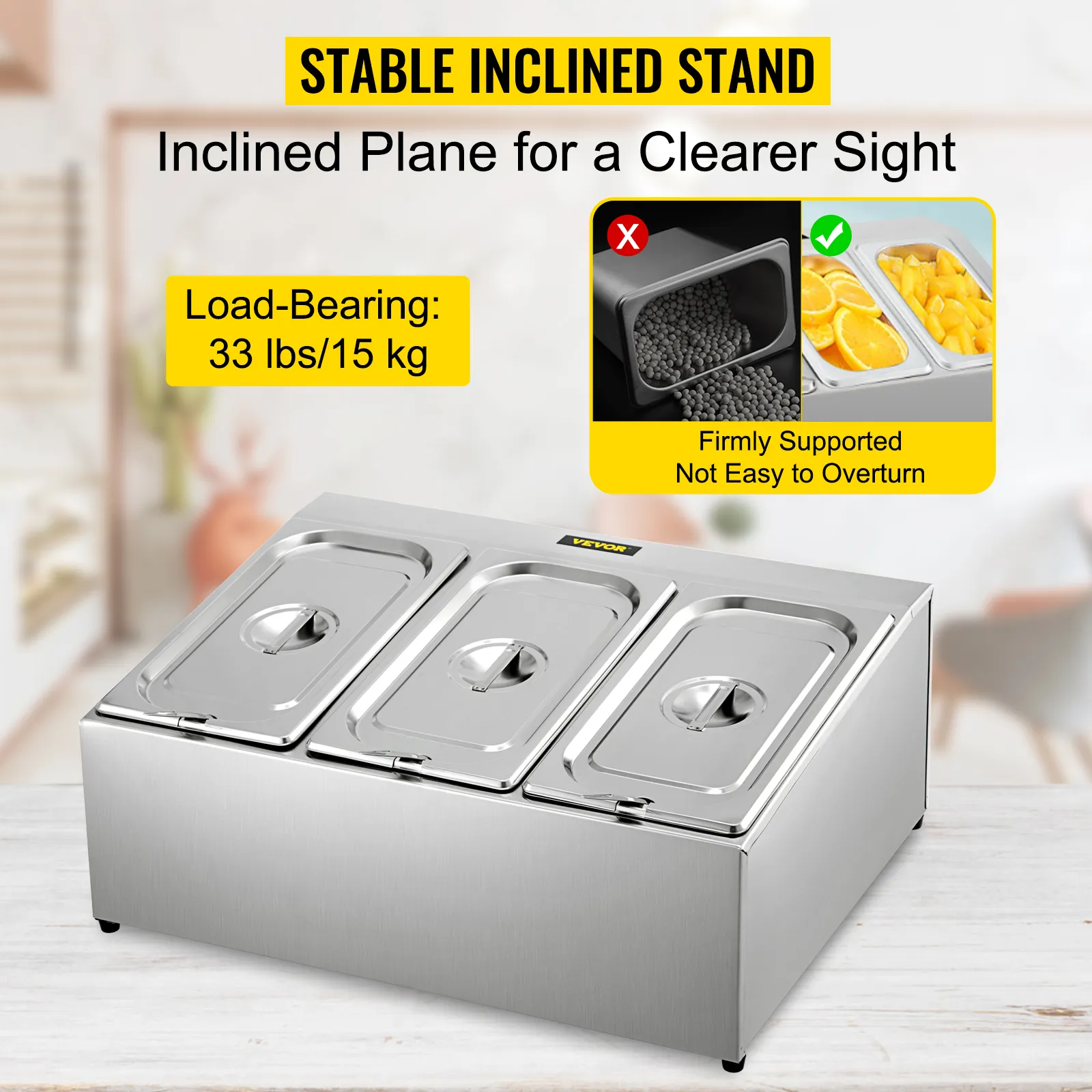 En comparación con la colocación directa de los recipientes para alimentos sobre la mesa, que tiende a volcarse o volcarse, este marco inclinado brinda una vista más clara y un soporte firme, que sostiene varios recipientes para alimentos de manera estable. PS Su capacidad de carga alcanza los 33 lbs/15 kg.
