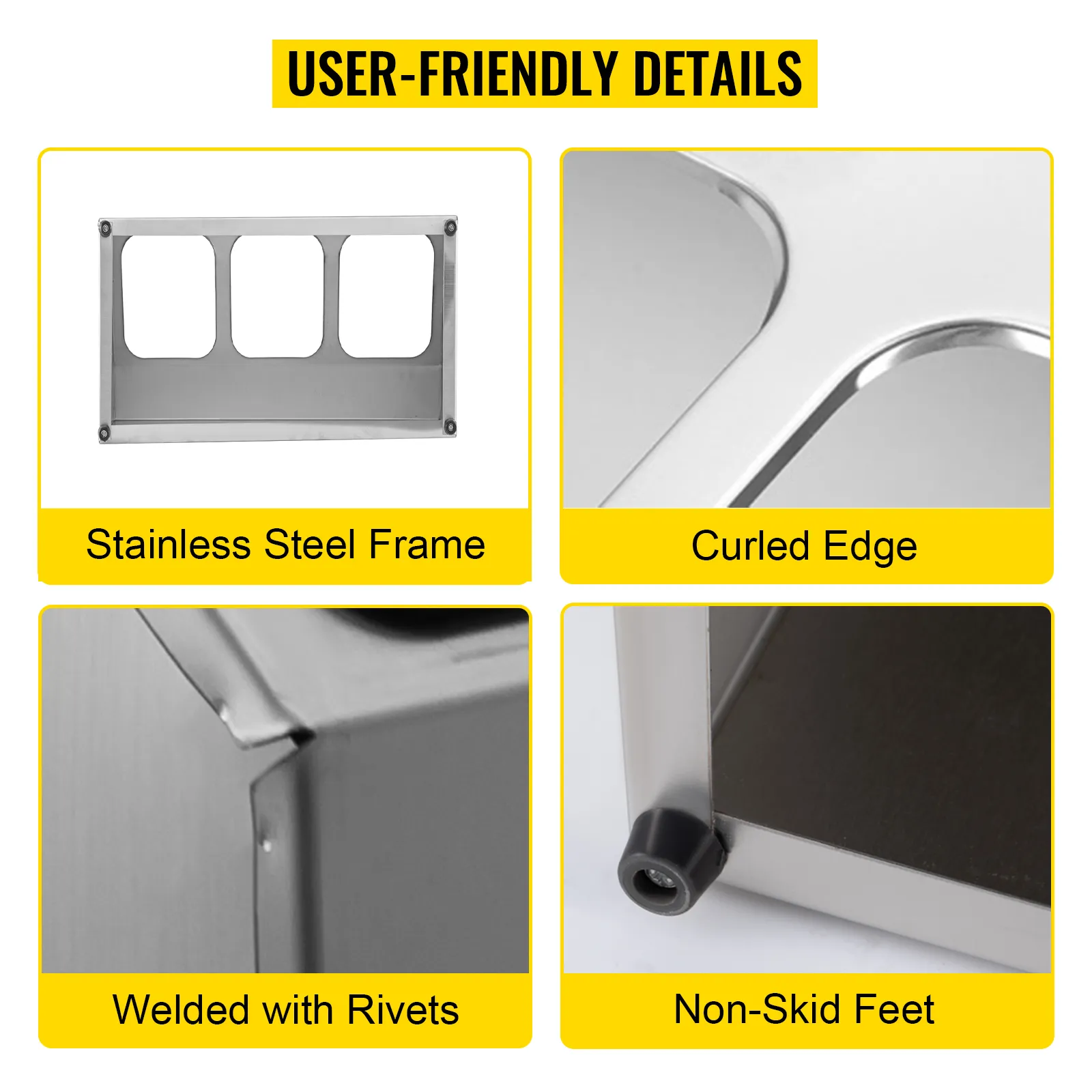 El marco de acero inoxidable está soldado herméticamente con remaches, construido para durar y no se afloja, sujetando firmemente las sartenes. El borde rizado puede evitar que sus manos se lastimen. Y los pies antideslizantes estabilizan el estante para especias en la mesa sin dejar rayones.