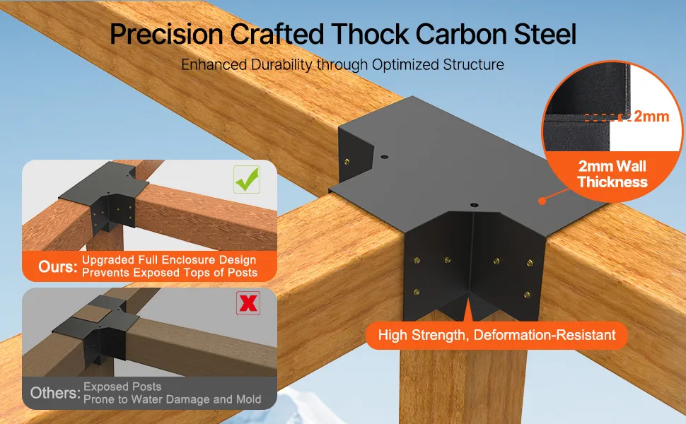 Duraderos y resistentes, nuestros soportes de pérgola de cuatro vías están diseñados para proteger las vigas de madera del agua de lluvia y la luz solar intensa.