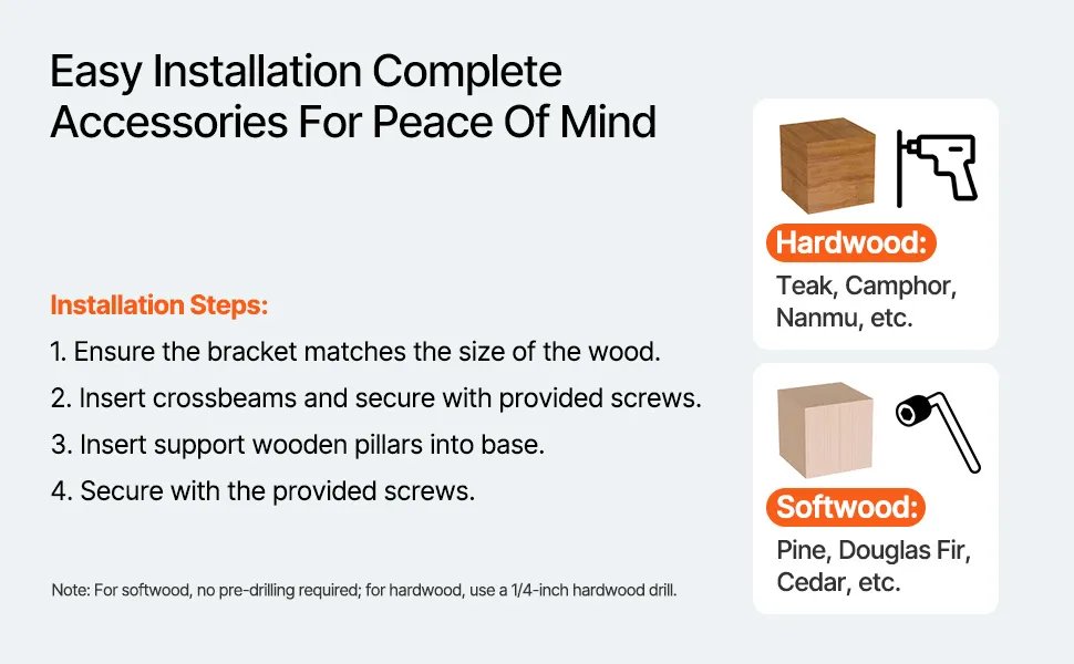 • Accesorios completos, fácil instalación: El kit de pérgola incluye 2 soportes de esquina de acero, 2 placas base de acero, 16 tornillos de expansión de acero inoxidable y 64 tornillos de perforación. Simplemente corte la madera a la longitud deseada, insértela en los soportes de esquina y ajústela. A continuación, monte la estructura y fíjela firmemente insertando los postes de soporte en las placas base. El proceso es sencillo y rápido, e incluso personas sin experiencia pueden montarlo fácilmente.