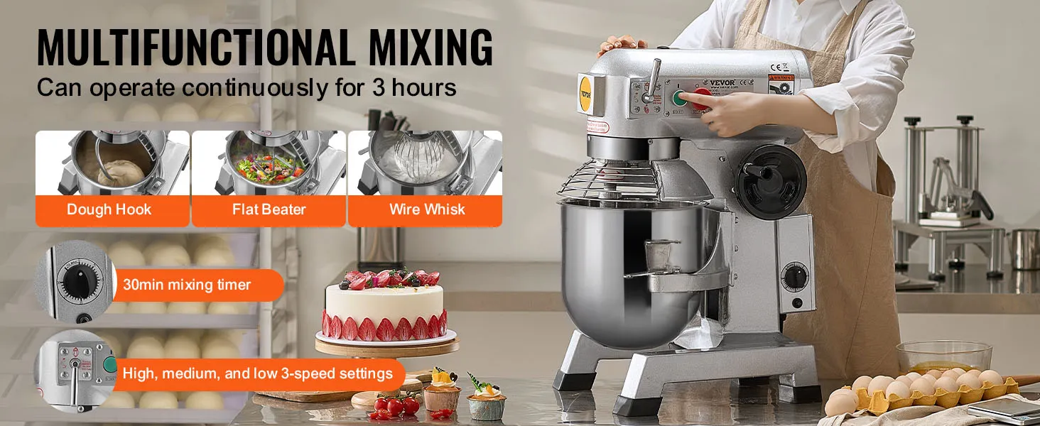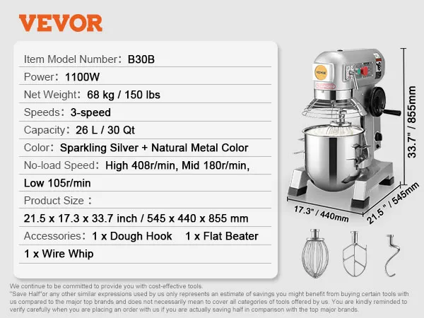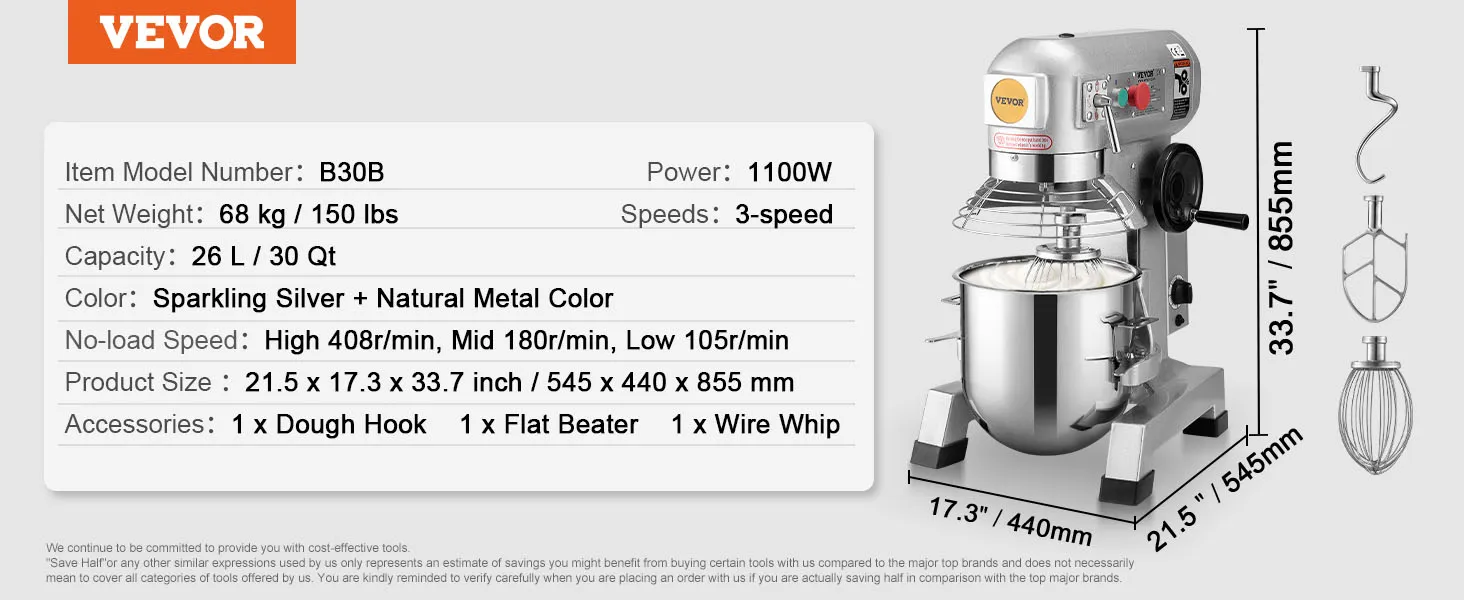 VEVOR Commercial Food Mixer, 30Qt Commercial Mixer with Timing Function, 1100W Stainless Steel Bowl Heavy Duty Electric Food Mixer Commercial with 3 Speeds Adjustable 108/199/382 RPM, Dough Hook Whisk VEVOR Commercial Food Mixer, 30Qt Commercial Mixer with Timing Function, 1100W Stainless Steel Bowl Heavy Duty Electric Food Mixer Commercial with 3 Speeds Adjustable 108/199/382 RPM, Dough Hook Whisk