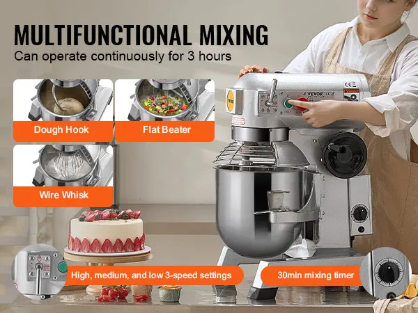 • Efficient Mixing System: With a 1100W powerful motor and gear-driven transmission system, it achieves fast and uniform mixing. It offers 3 adjustable speeds to meet different mixing requirements and achieve satisfactory results. The low speed of 105r/min is suitable for kneading dough, the medium speed of 180r/min is typically used for mixing fillings, and the high speed of 408r/min is ideal for whipping cream. Always stop the machine before changing speeds.