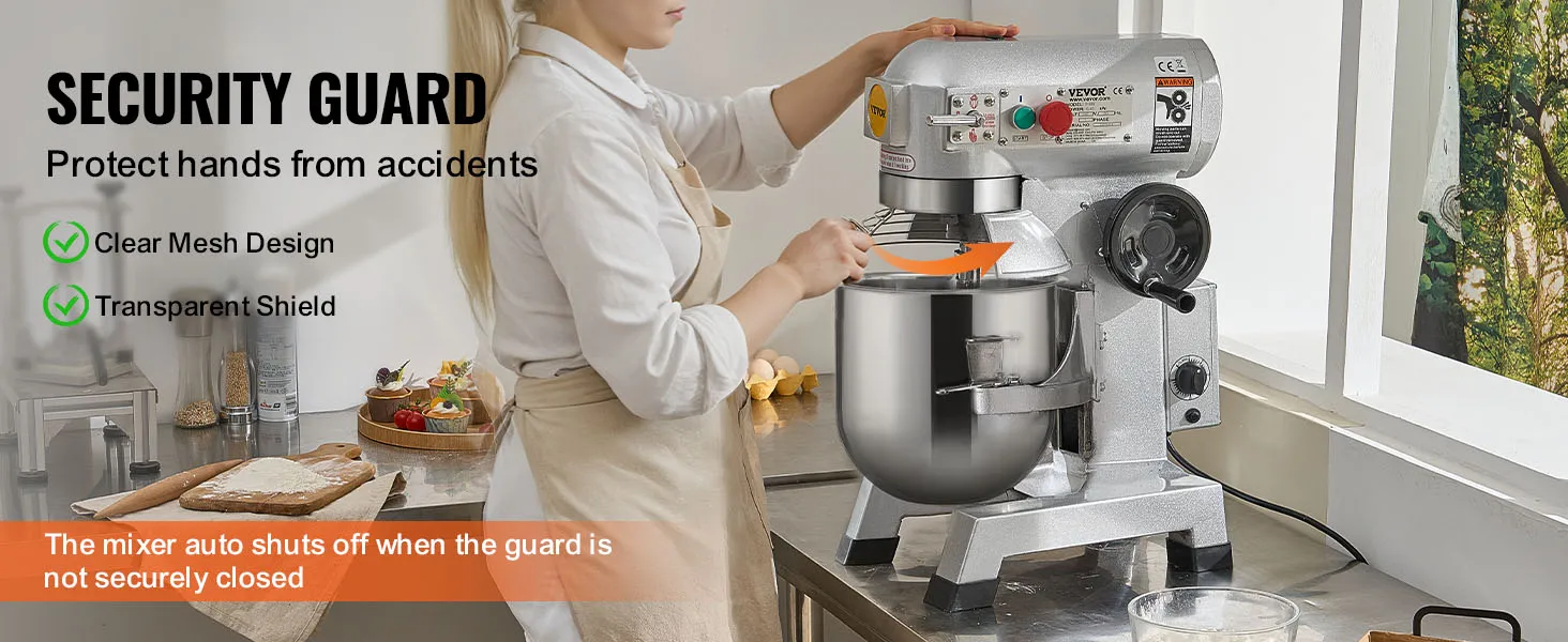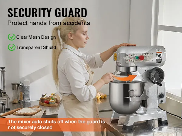 The guard prevents accidents and ingredient splashes while providing visibility into the mixing process. It features an automatic shutdown function that stops the machine immediately if the cover is open or not securely closed.