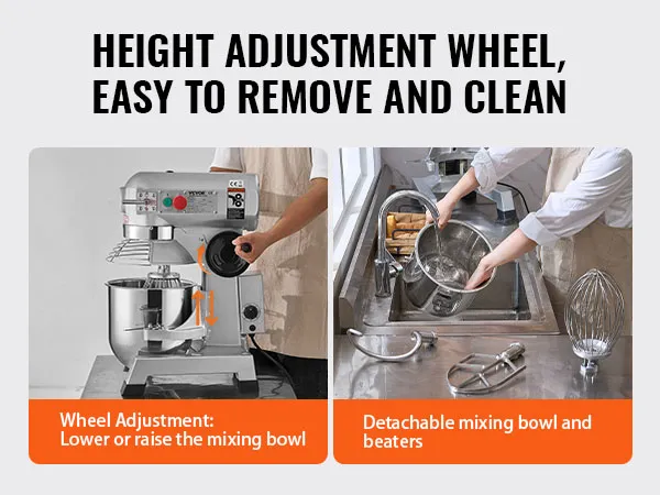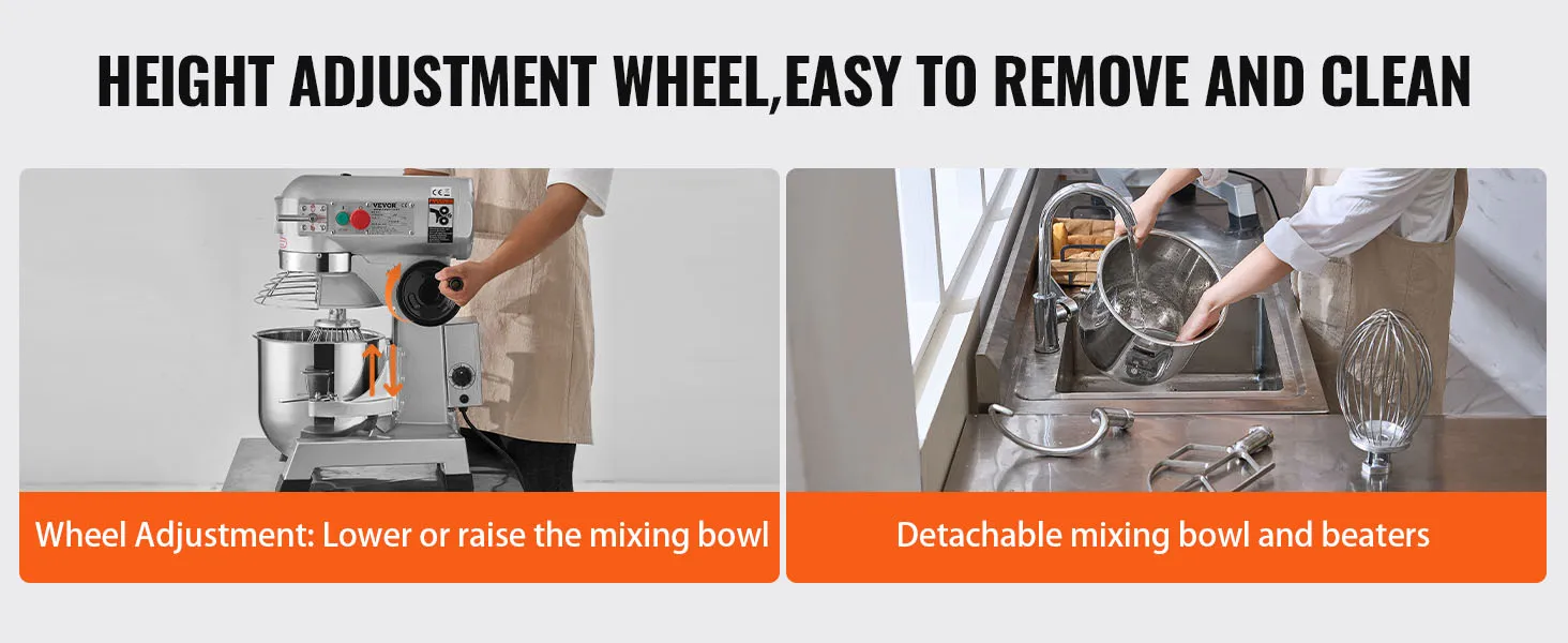The wheel-style adjuster allows easy lowering or raising of the bowl. With detachable bowl and beaters, cleaning is made simple.